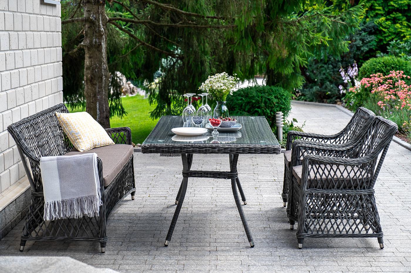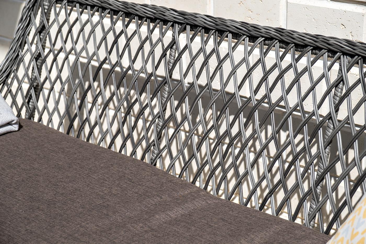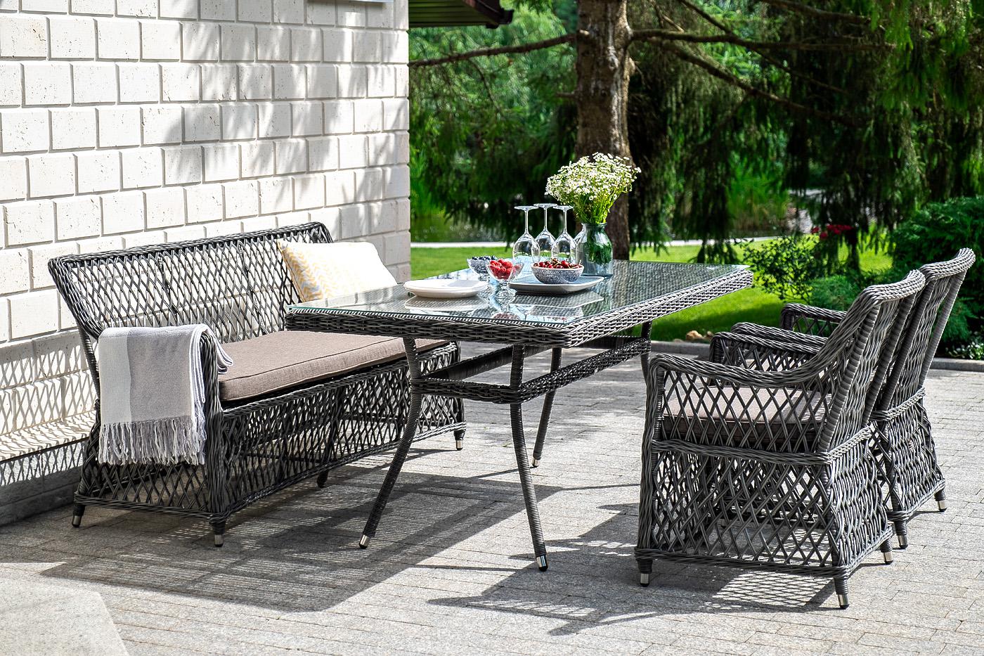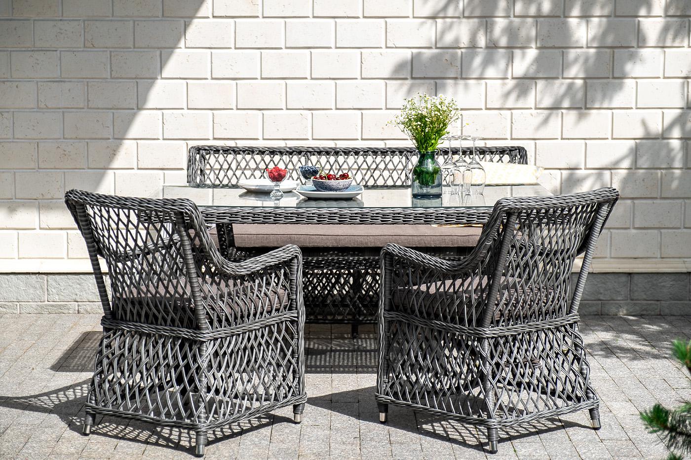 Обеденная группа «Катания» рассчитана на четыре персоны. Набор мебели включает: - прямоугольный обеденный стол «Латте», размером - 1600×900×750 мм. - двухместный диван «Латте» - 1600×660×850 мм. - 2 кресла «Латте», размер одного кресла - 550×660×850 мм. Все предметы мебели изготовлены из прочного алюминия, вручную оплетенного долговечным искусственным ротангом. На креслах и диване предусмотрены подушки со съёмными чехлами и влагостойкой пропиткой. Стол укомплектован прочным стеклом толщино "Латте" плетеный стол из искусственного ротанга 160х90см, цвет графит 1шт. 1 600Х900Х750, "Латте" диван двухместный из искусственного ротанга, цвет графит 1шт. 1 600Х660Х850, "Латте" плетеное кресло из искусственного ротанга, цвет графит 2шт. 550Х660Х850,