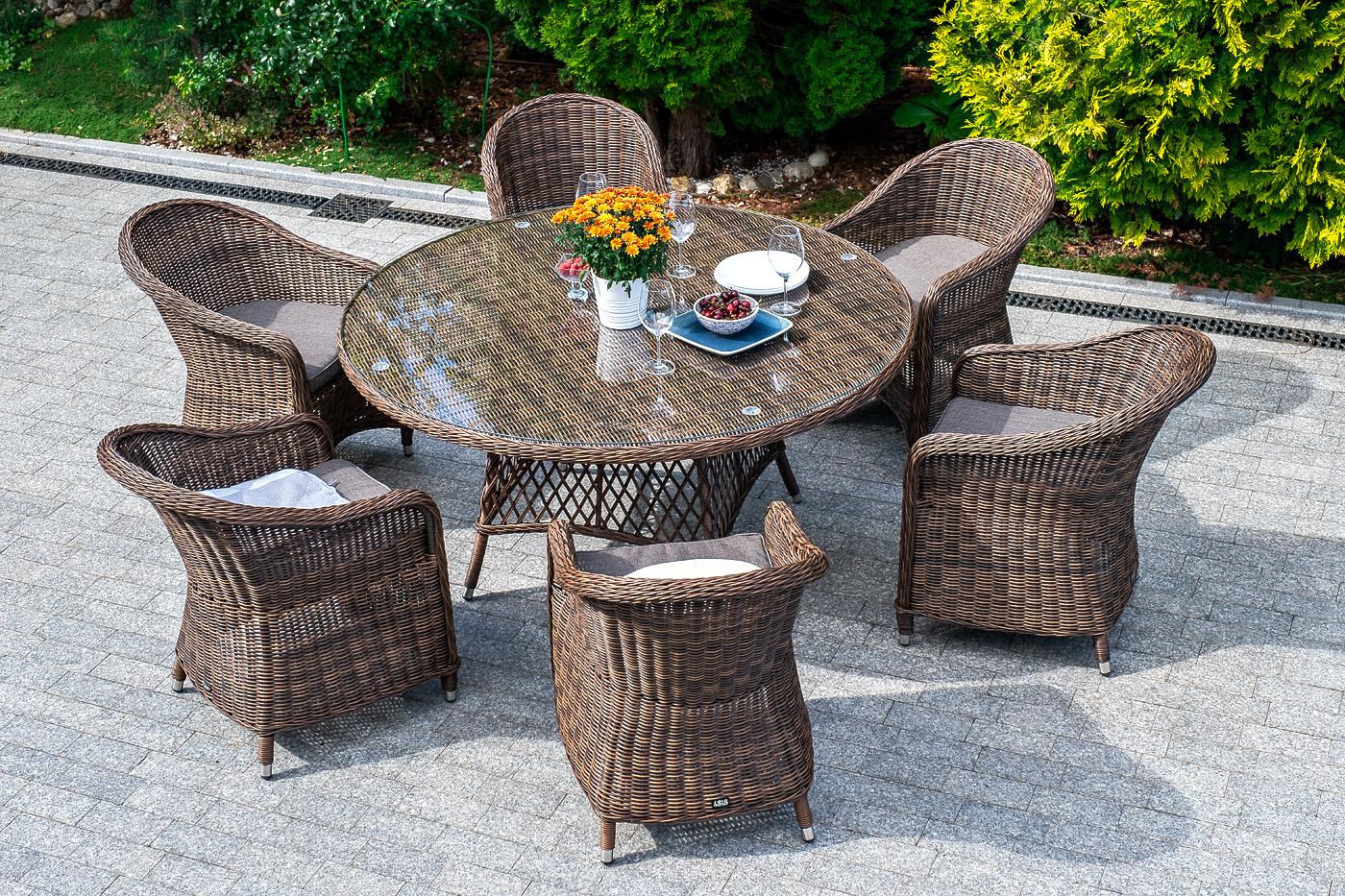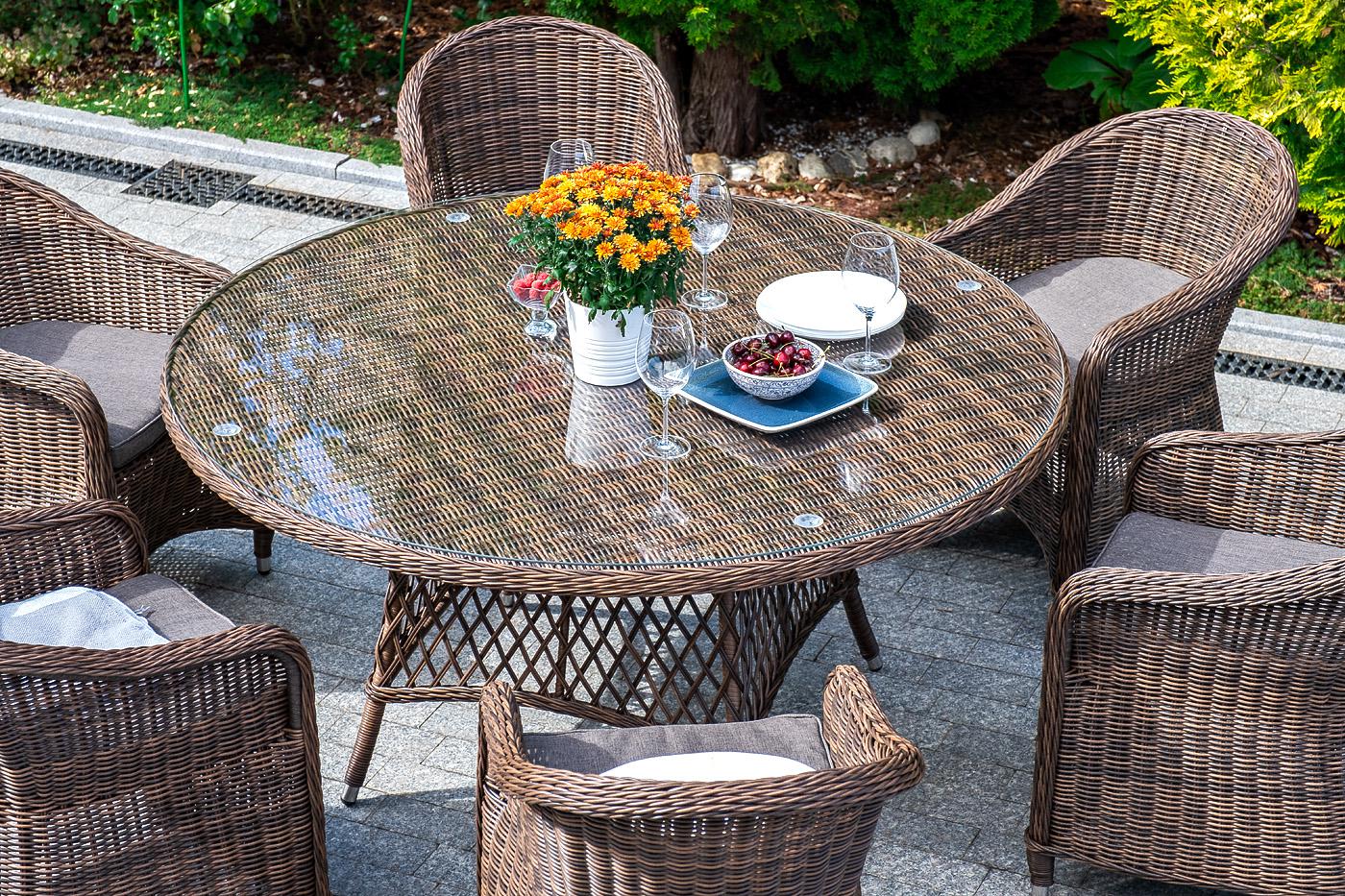 В комплект входит круглый обеденный стол «Эспрессо» (1500×1500×750 мм) с ударопрочной стеклянной столешницей и 6 кресел коллекции «Равенна» 570×680×810 мм. Вся мебель изготовлена из долговечного и легкого алюминия, обтянутого синтетическим ротангом. На столе для удобства эксплуатации предусмотрена столешница из ударопрочного закаленного стекла 5 мм. Стулья укомплектованы подушками на сидениях. Параметры кресел без подушек: Глубина сидения – 500 мм; Высота сидения – 440 мм; Высота спинки – 400 "Эспрессо" плетеный круглый стол, диаметр 150 см, цвет коричневый 1шт. 1 500Х1 500Х750, "Равенна" плетеное кресло из искусственного ротанга, цвет коричневый 6шт. 570Х680Х810,