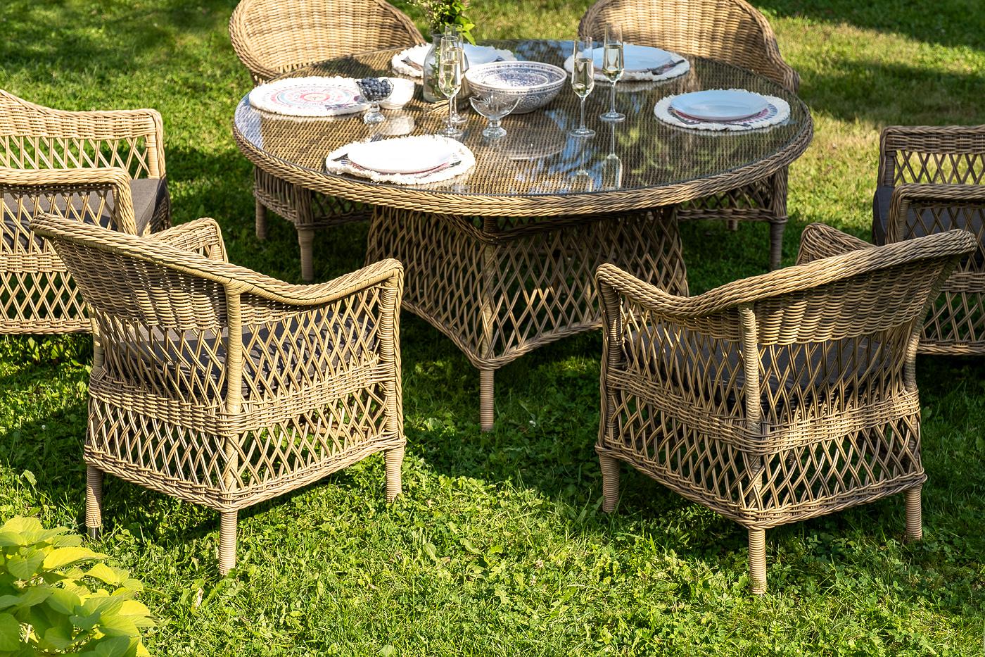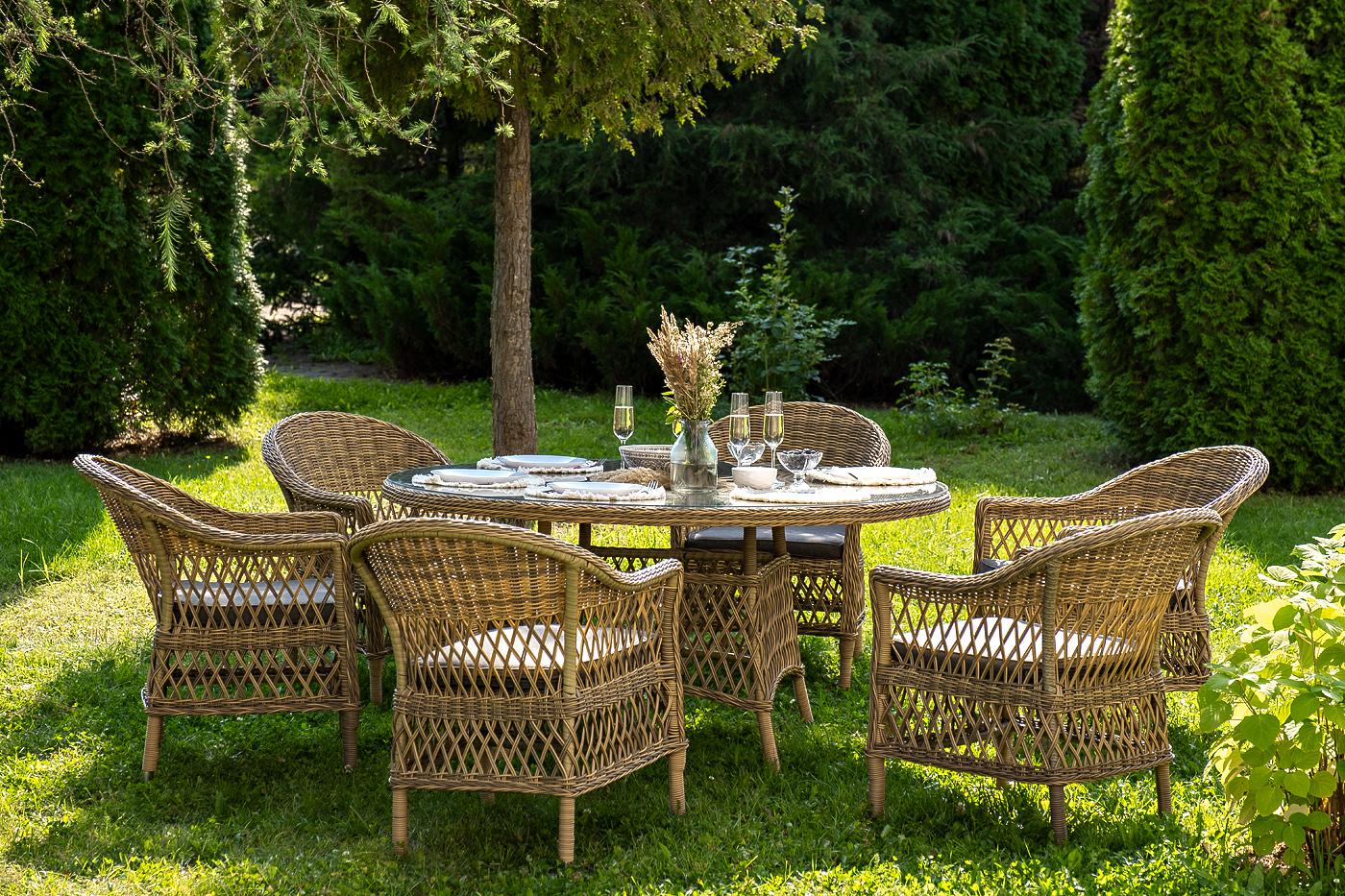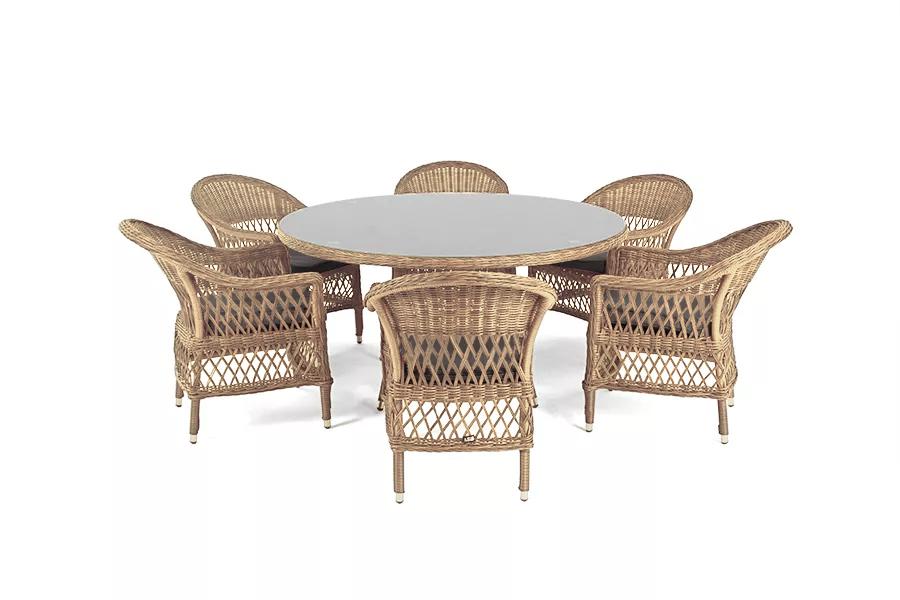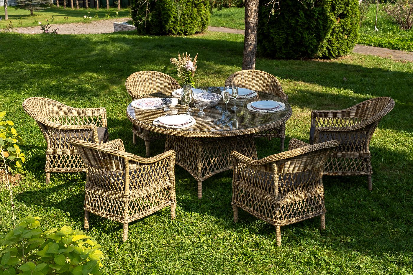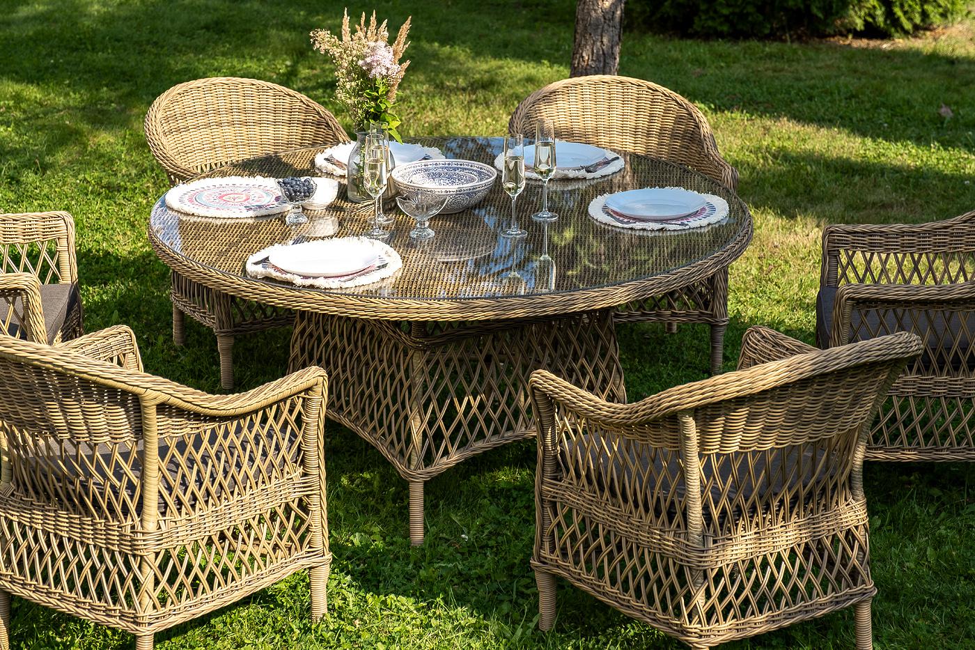 В комплект входит круглый обеденный стол «Эспрессо» (1500×1500×750 мм) с ударопрочной стеклянной столешницей и 6 кресел коллекции «Сицилия» (590×640×820 мм). Цвет - соломенный. Вся мебель изготовлена из долговечного и легкого алюминия, обтянутого синтетическим ротангом. На столе для удобства эксплуатации предусмотрена столешница из ударопрочного закаленного стекла 5 мм. Стулья укомплектованы подушками на сидениях. Параметры кресел без подушек: Глубина сидения – 480 мм; Высота сидения – 420 мм "Эспрессо" плетеный круглый стол, диаметр 150 см, цвет соломенный 1шт. 1 500Х1 500Х750, "Сицилия" плетеный стул из искусственного ротанга, цвет соломенный 6шт. 590Х640Х820,