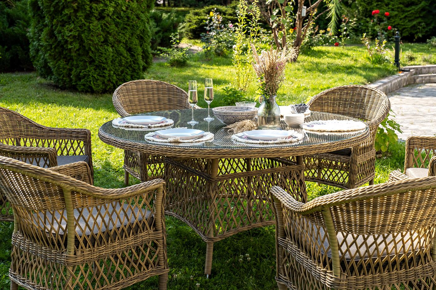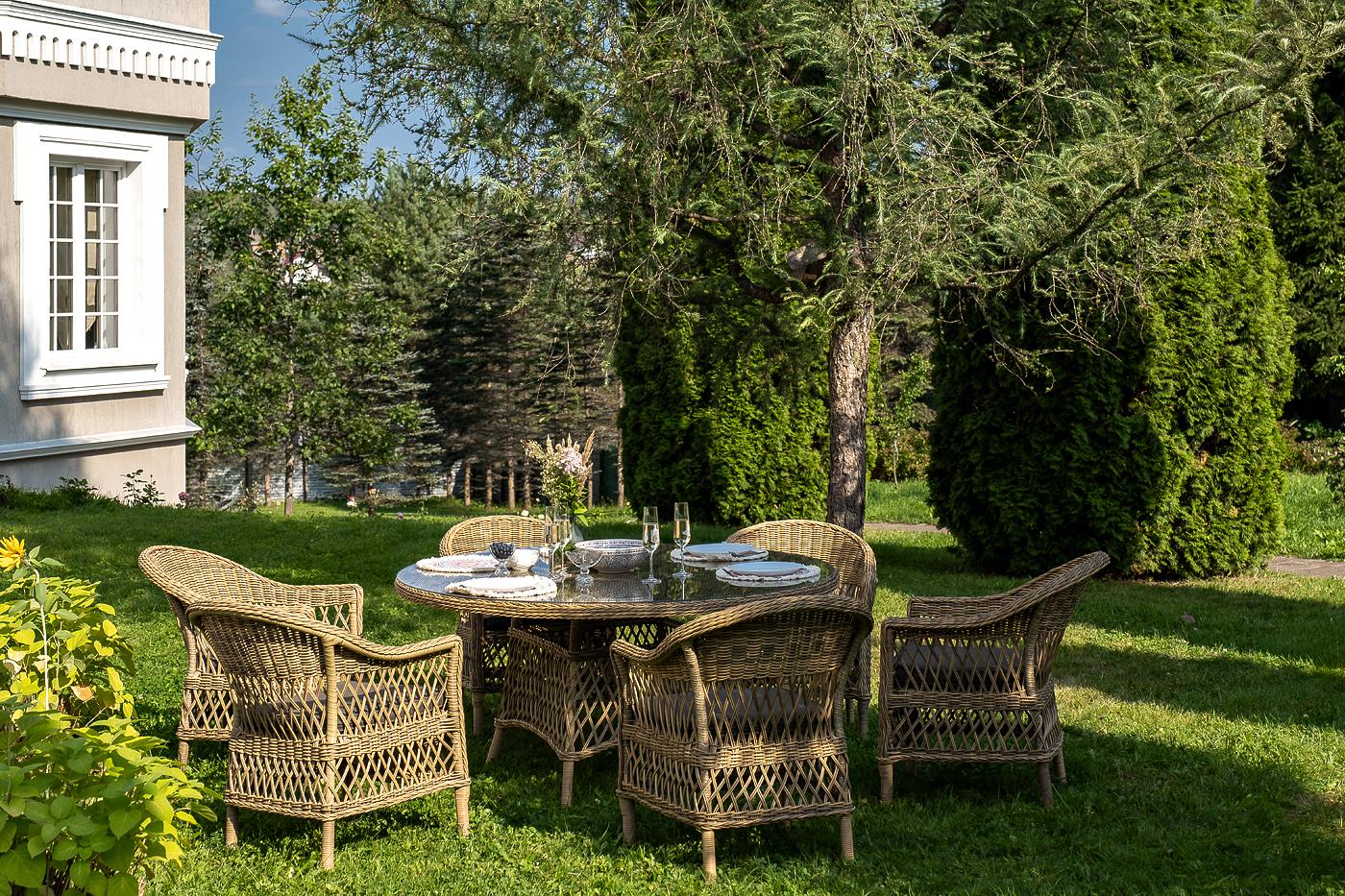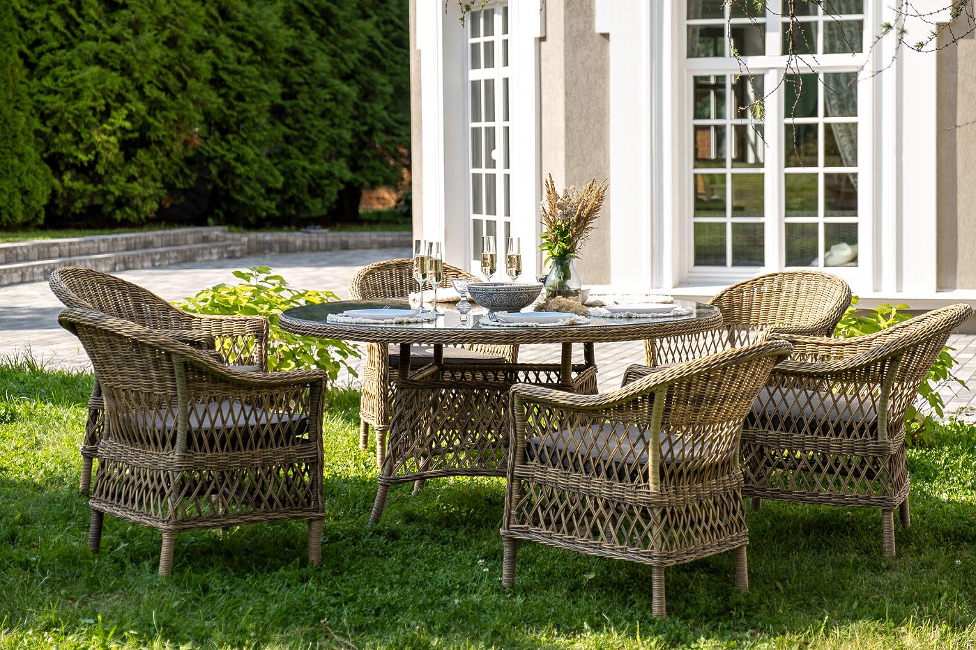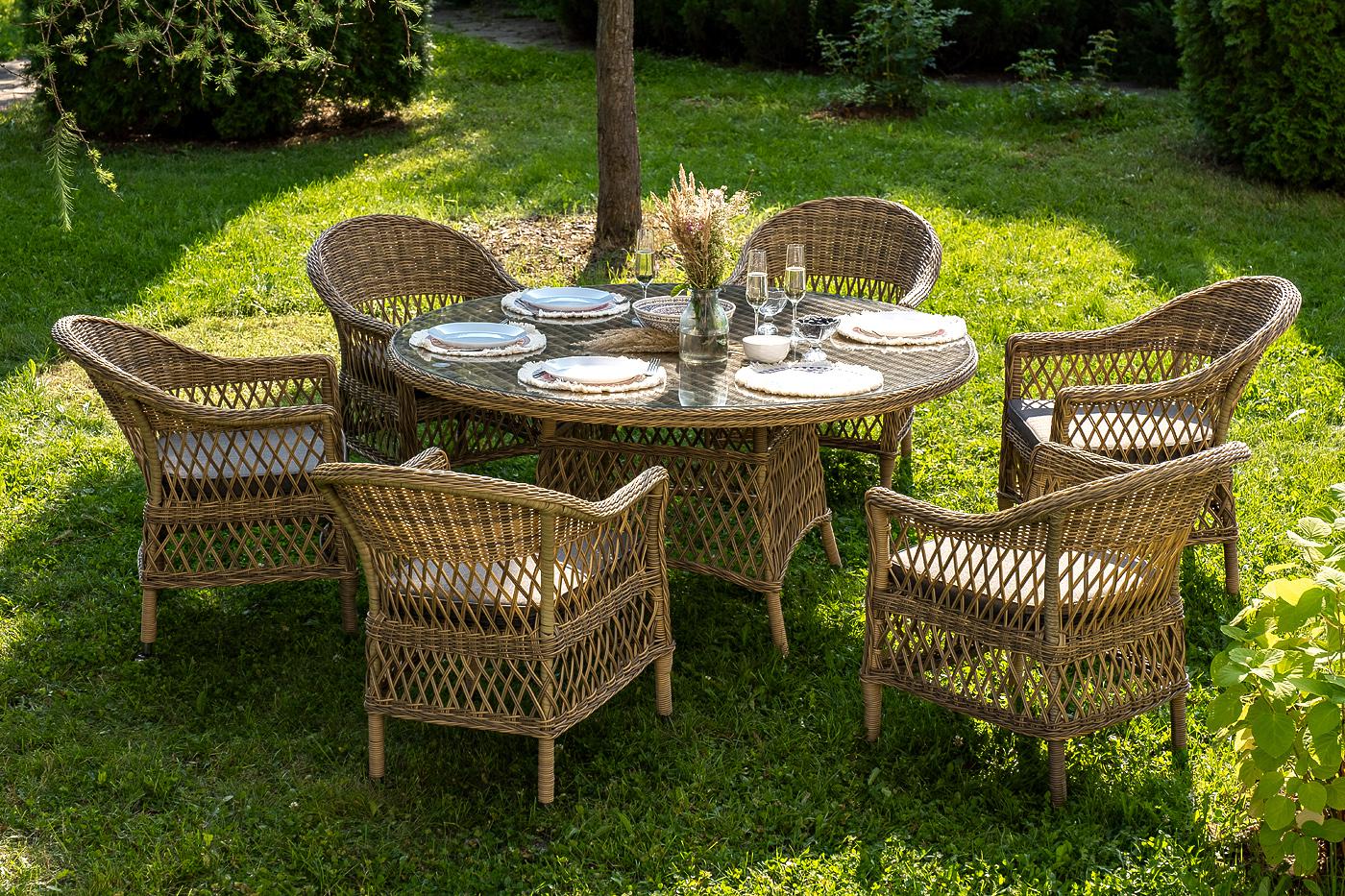 В комплект входит круглый обеденный стол «Эспрессо» (1500×1500×750 мм) с ударопрочной стеклянной столешницей и 6 кресел коллекции «Сицилия» (590×640×820 мм). Цвет - соломенный. Вся мебель изготовлена из долговечного и легкого алюминия, обтянутого синтетическим ротангом. На столе для удобства эксплуатации предусмотрена столешница из ударопрочного закаленного стекла 5 мм. Стулья укомплектованы подушками на сидениях. Параметры кресел без подушек: Глубина сидения – 480 мм; Высота сидения – 420 мм "Эспрессо" плетеный круглый стол, диаметр 150 см, цвет соломенный 1шт. 1 500Х1 500Х750, "Сицилия" плетеный стул из искусственного ротанга, цвет соломенный 6шт. 590Х640Х820,
