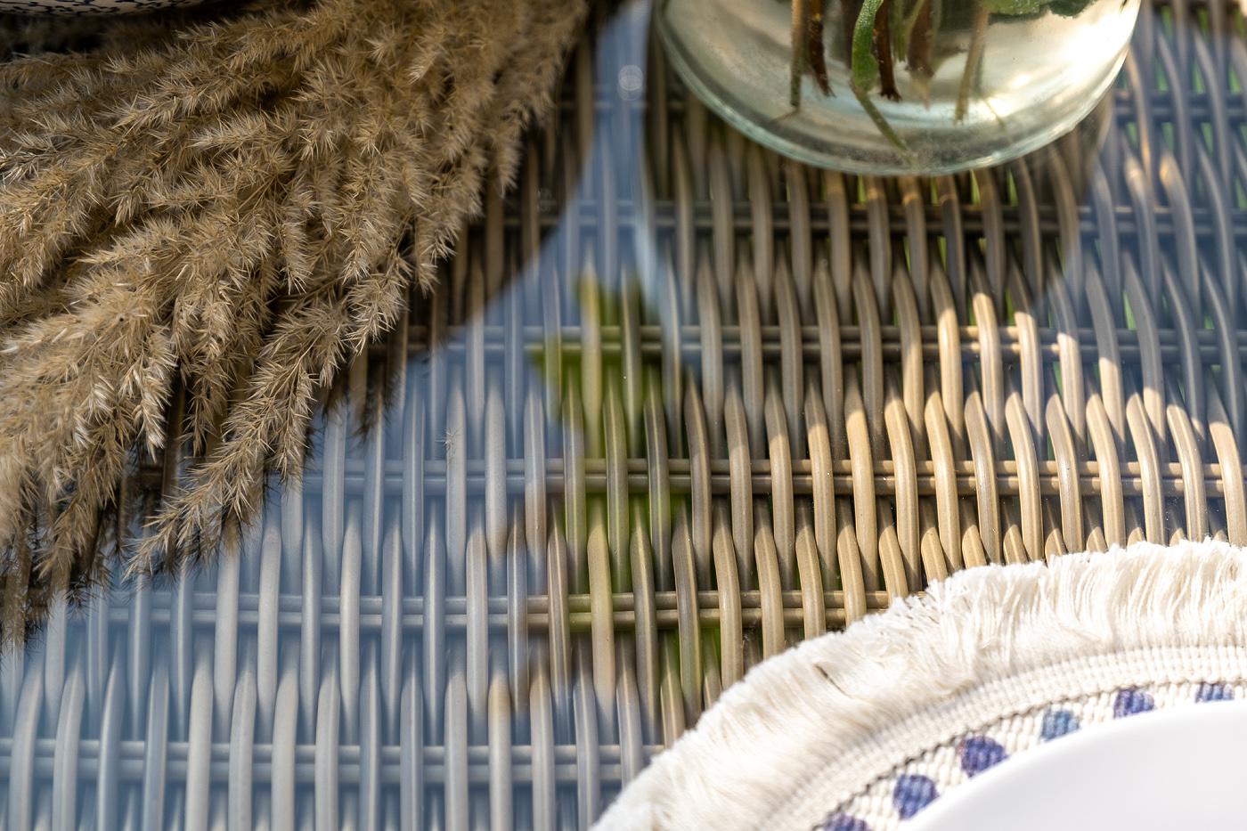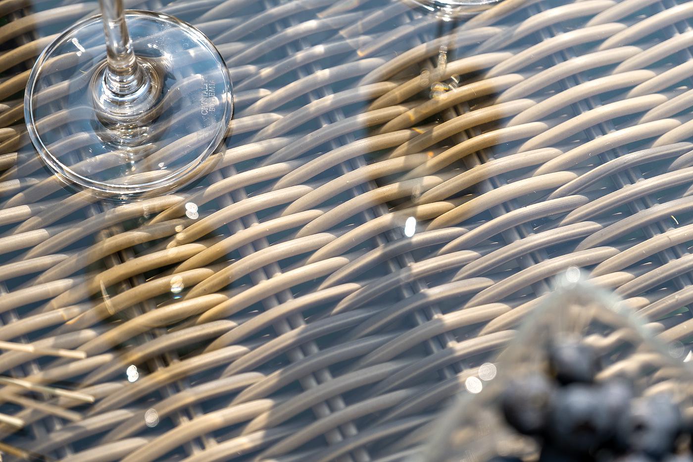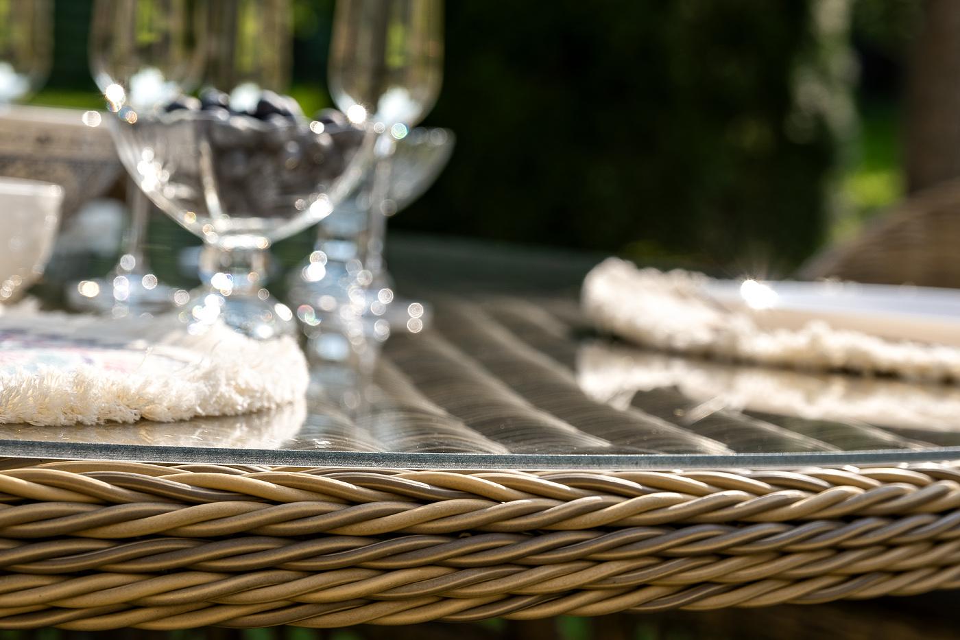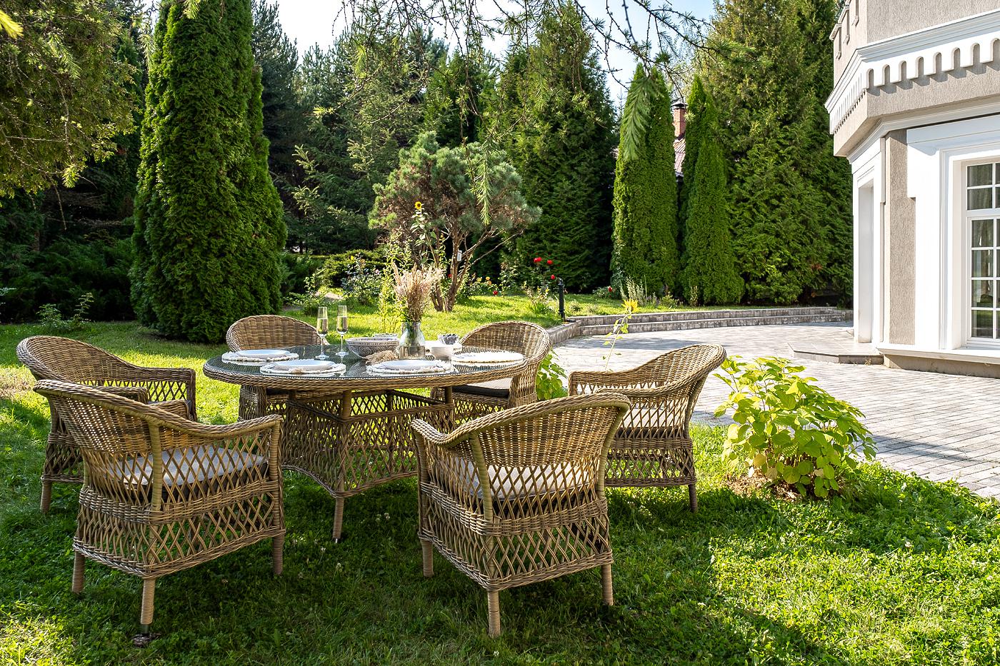 В комплект входит круглый обеденный стол «Эспрессо» (1500×1500×750 мм) с ударопрочной стеклянной столешницей и 6 кресел коллекции «Сицилия» (590×640×820 мм). Цвет - соломенный. Вся мебель изготовлена из долговечного и легкого алюминия, обтянутого синтетическим ротангом. На столе для удобства эксплуатации предусмотрена столешница из ударопрочного закаленного стекла 5 мм. Стулья укомплектованы подушками на сидениях. Параметры кресел без подушек: Глубина сидения – 480 мм; Высота сидения – 420 мм "Эспрессо" плетеный круглый стол, диаметр 150 см, цвет соломенный 1шт. 1 500Х1 500Х750, "Сицилия" плетеный стул из искусственного ротанга, цвет соломенный 6шт. 590Х640Х820,