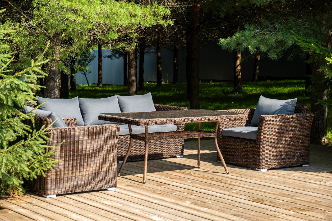 Премиальная обеденная группа «Моккачино» для обустройства зоны отдыха в саду, на террасе, веранде. Набор включает: - большой обеденный стол «Латте», размер - 2000×900×750 мм. - трехместный диван «Капучино», размер - 2200×865×815 мм. - два кресла «Капучино», размер каждого - 1040×865×815 мм. Каркас мебели изготовлен из алюминия, вручную оплетенного искусственным ротангом. Материал столешницы – ударопрочное стекло 5мм. Комплект представлен в насыщенном шоколадном оттенке с серыми подушками "Капучино" диван из искусственного ротанга трехместный, цвет коричневый 1шт. 2 220Х865Х815, "Капучино" кресло из искусственного ротанга, цвет коричневый 2шт. 1 040Х865Х815, "Латте" плетеный стол из искусственного ротанга 200х90см, цвет коричневый 1шт. 2 000Х900Х750,
