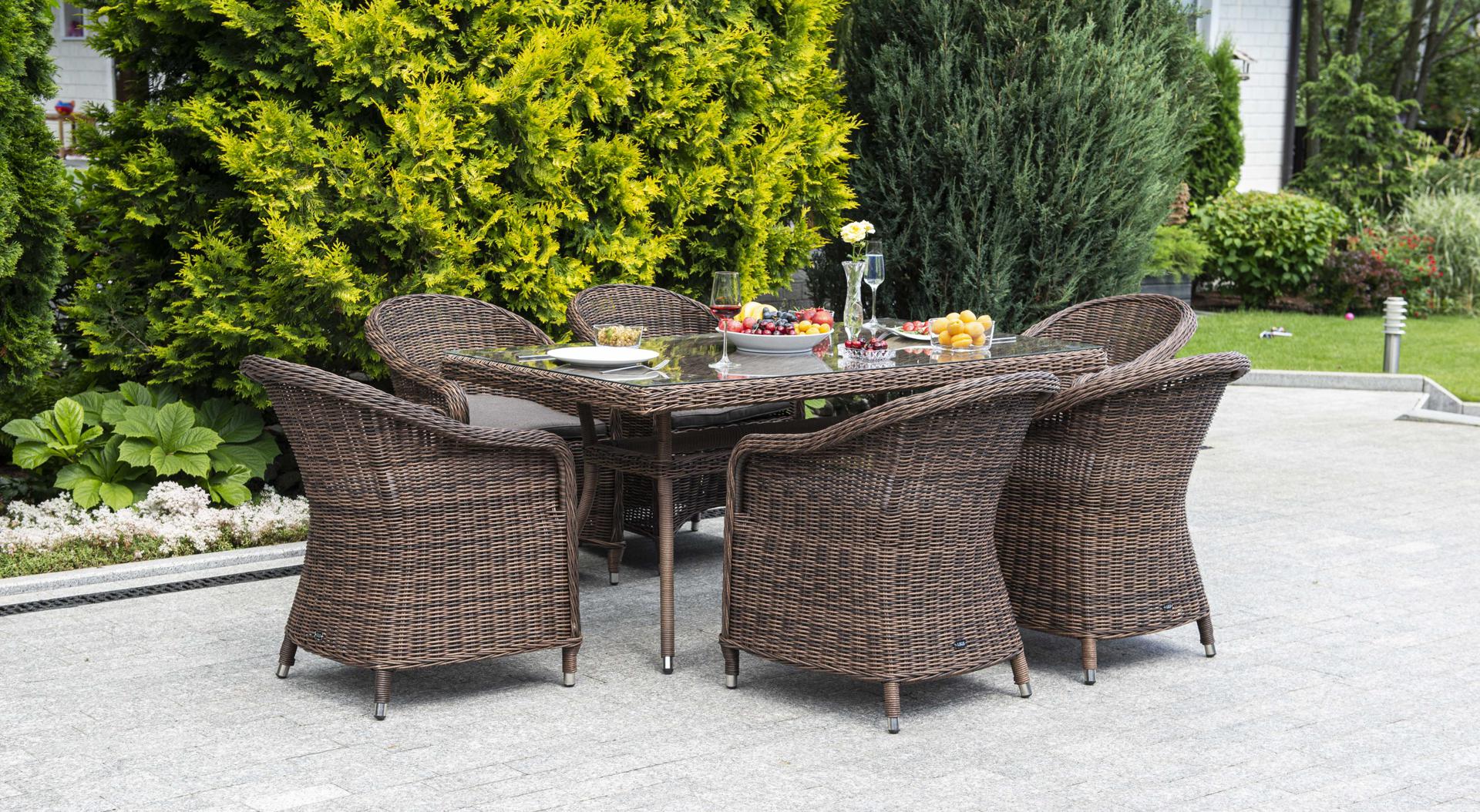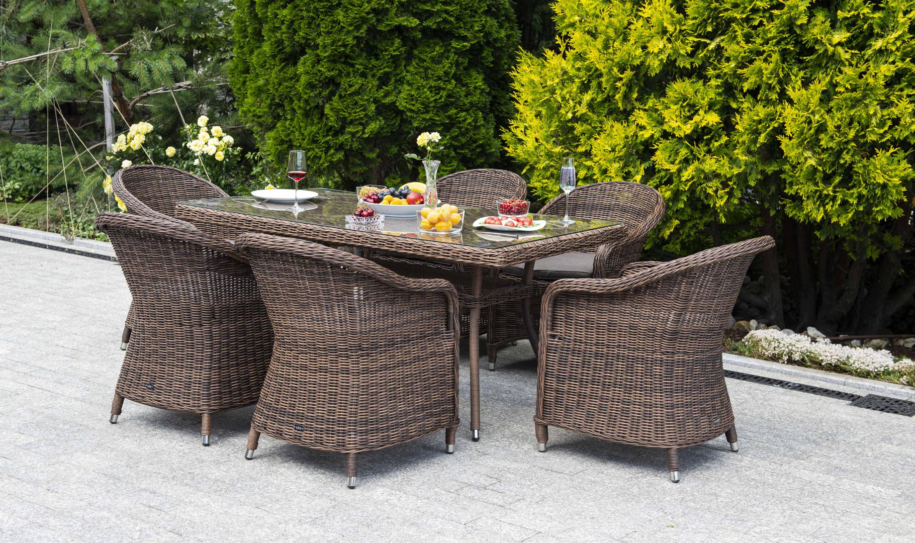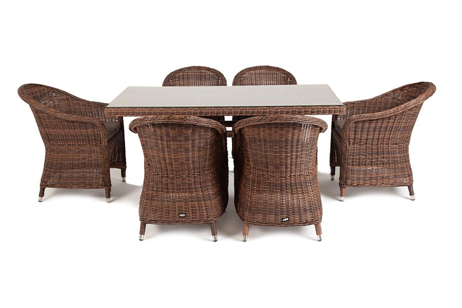 Премиальная обеденная группа для сада, веранды ресторана «Эспрессо» для большой компании. В набор входит большой прямоугольный стол «Латте», размером - 1600×900×750 мм и 6 кресел «Равенна», размер - 570×680×810 мм, в насыщенном коричневом оттенке. Каркас всех предметов мебели изготовлен из легкого и прочного алюминия, оплетенного вручную долговечным искусственным ротангом. Стол для удобства использования накрыт прочным стеклом, кресла укомплектованы подушками со съёмными чехлами серого цвета "Латте" плетеный стол из искусственного ротанга 160х90см, цвет коричневый 1шт. 1 600Х900Х750, "Равенна" плетеное кресло из искусственного ротанга, цвет коричневый 6шт. 570Х680Х810,