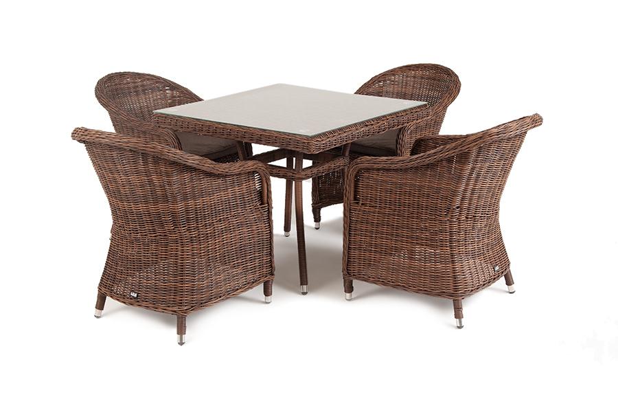 Обеденная группа «Фредо» для сада, веранды, летней площадки ресторана. В набор входит квадратный стол «Айриш» (900×900×750 мм) и 4 кресла «Равенна» (570×680×810 мм) в насыщенном коричневом оттенке. Каркас мебели выполнен из легкого и долговечного алюминия, оплетенного вручную синтетической ротанговой лозой. Кресла идут с подушками в комплекте. Материал столешницы – ударопрочное стекло 5 мм. Обеденная группа идеальна для обустройства лаунж-зоны на открытом пространстве поскольку устойчива "Айриш" стол плетеный из искусственного ротанга, цвет коричневый 1шт. 900Х900Х750, "Равенна" плетеное кресло из искусственного ротанга, цвет коричневый 4шт. 570Х680Х810,