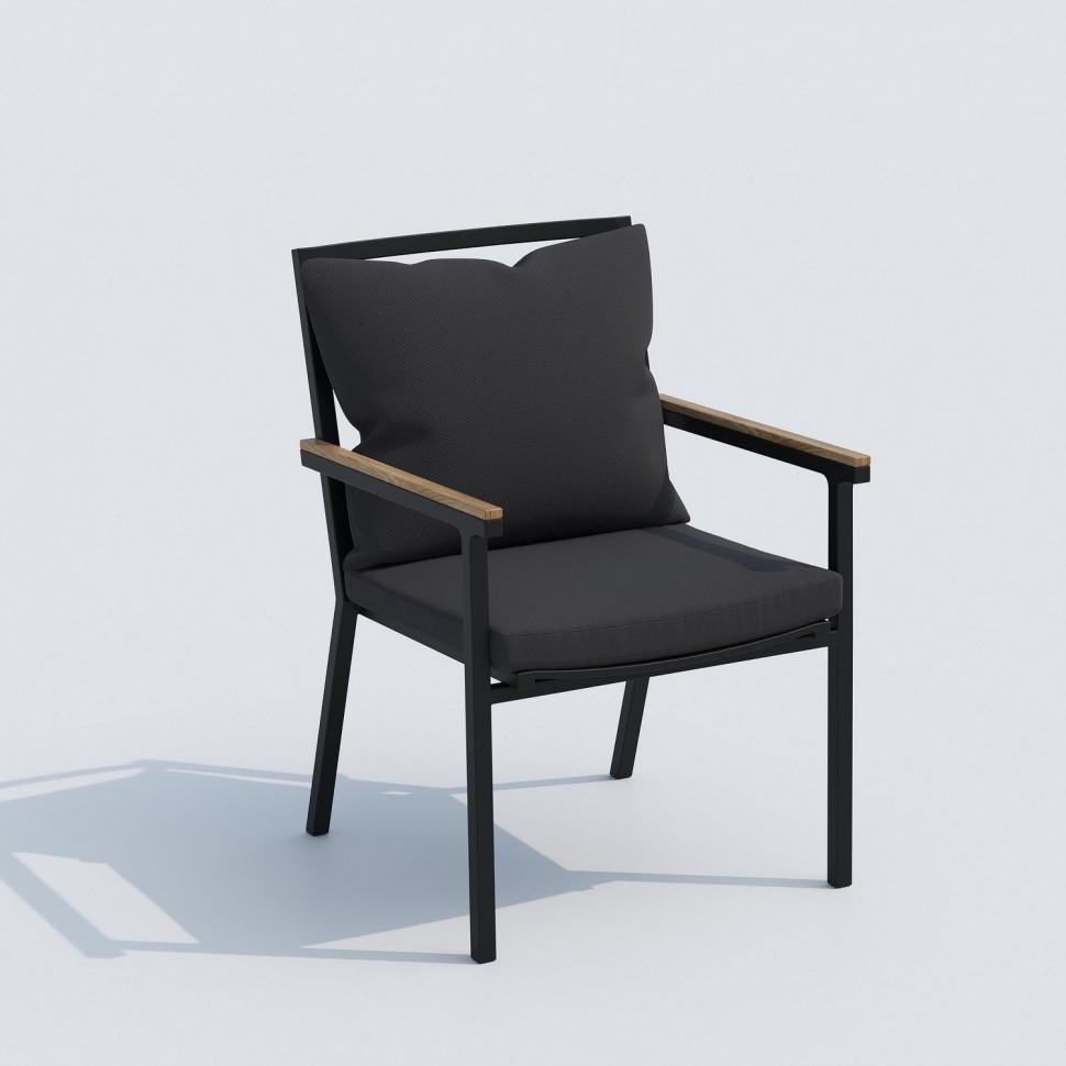 Каркас мебели выполнен из всесезонного алюминия с порошковым покрытием темно-серого цвета, подлокотники стульев декорированы вставками из тика, подушки сидений и спинок обшиты уличной тканью темно-серого цвета с водоотталкивающей пропиткой, толщина подушек 5 см, съемные чехлы на "молнии", столешница обеденного стола изготовлена из алюминиевых планок с порошковым покрытием темно-серого цвета