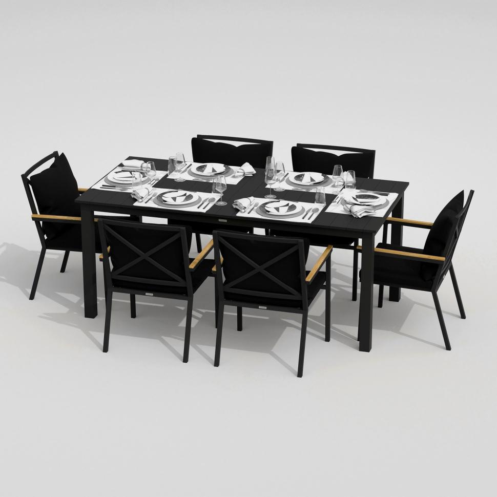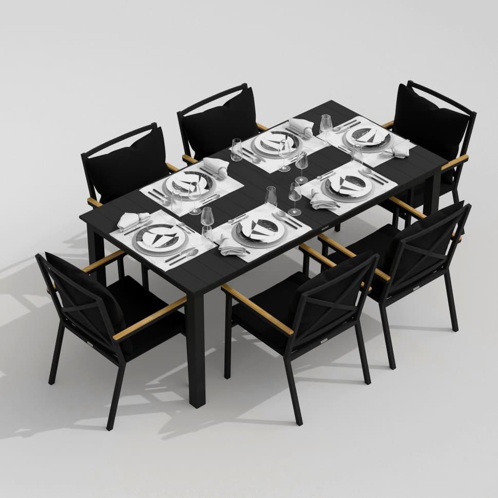 Каркас мебели выполнен из всесезонного алюминия с порошковым покрытием темно-серого цвета, подлокотники стульев декорированы вставками из тика, подушки сидений и спинок обшиты уличной тканью черного цвета с водоотталкивающей пропиткой, толщина подушек 5 см, съемные чехлы на "молнии", столешница обеденного стола изготовлена из алюминиевых планок с порошковым покрытием темно-серого цвета