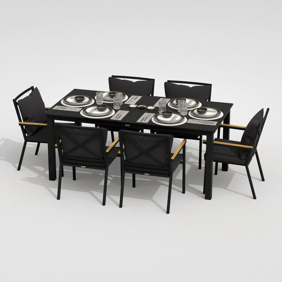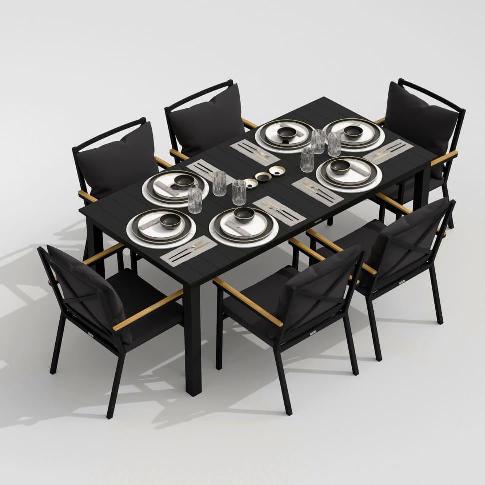 Каркас мебели выполнен из всесезонного алюминия с порошковым покрытием темно-серого цвета, подлокотники стульев декорированы вставками из тика, подушки сидений и спинок обшиты уличной тканью темно-серого цвета с водоотталкивающей пропиткой, толщина подушек 5 см, съемные чехлы на "молнии", столешница обеденного стола изготовлена из алюминиевых планок с порошковым покрытием темно-серого цвета