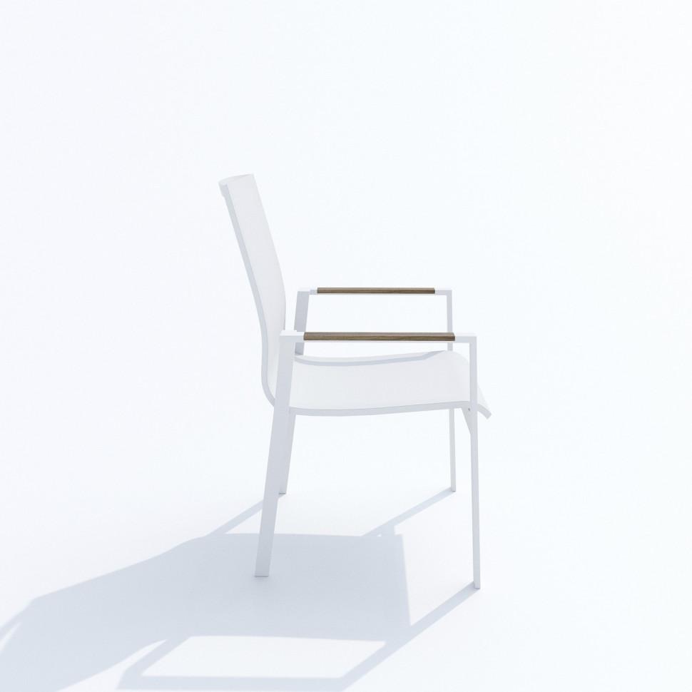 Каркас мебели выполнен из всесезонного алюминия с порошковым покрытием белого цвета, подлокотники стульев декорированы вставками из поливуда, сидение из текстилена белого цвета, столешница обеденного стола изготовлена из поливуда (древесно-полимерного композита)