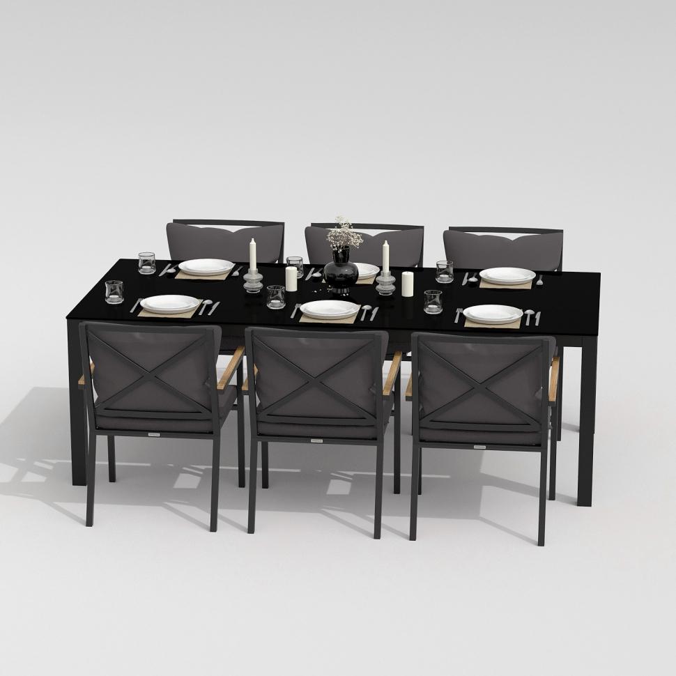 Каркас мебели выполнен из всесезонного алюминия с порошковым покрытием темно-серого цвета (карбон), подлокотники стульев декорированы вставками из тика, подушки сидений и спинок обшиты уличной тканью серого цвета с водоотталкивающей пропиткой, толщина подушек 5 см, съемные чехлы на "молнии", столешница обеденного стола глянцевая, изготовлена из закаленного стекла толщиной 5 мм, с нанесением черного цвета с помощью шелкотрафаретной печати