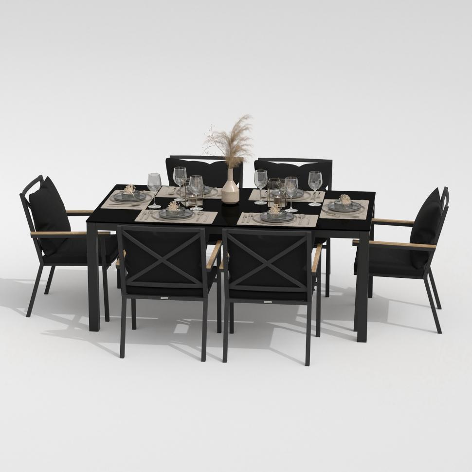 Каркас мебели выполнен из всесезонного алюминия с порошковым покрытием темно-серого цвета (карбон), подлокотники стульев декорированы вставками из тика, подушки сидений и спинок обшиты уличной тканью черного цвета с водоотталкивающей пропиткой, толщина подушек 5 см, съемные чехлы на "молнии", столешница обеденного стола глянцевая, изготовлена из закаленного стекла толщиной 5 мм, с нанесением черного цвета с помощью шелкотрафаретной печати