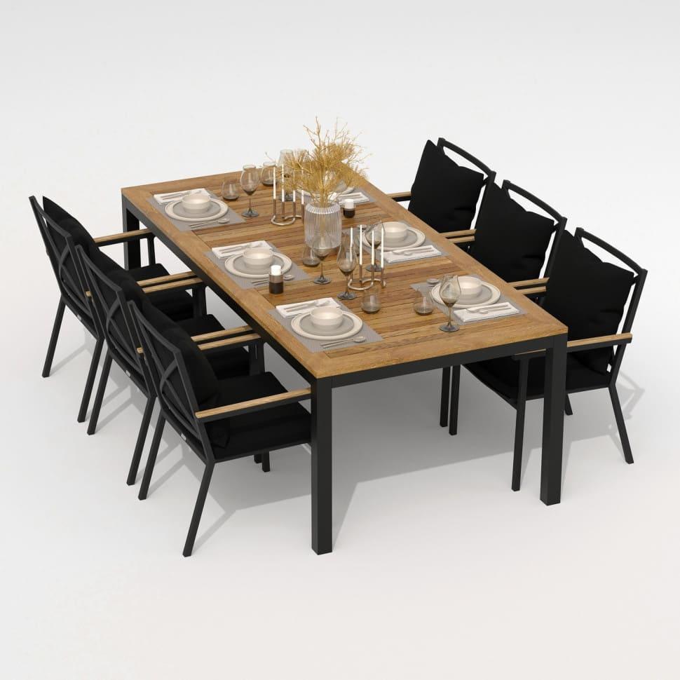 Каркас мебели выполнен из всесезонного алюминия с порошковым покрытием темно-серого цвета, подлокотники стульев декорированы вставками из тика, подушки сидений и спинок обшиты уличной тканью черного цвета с водоотталкивающей пропиткой, толщина подушек 5 см, съемные чехлы на "молнии", столешница обеденного стола изготовлена из тика