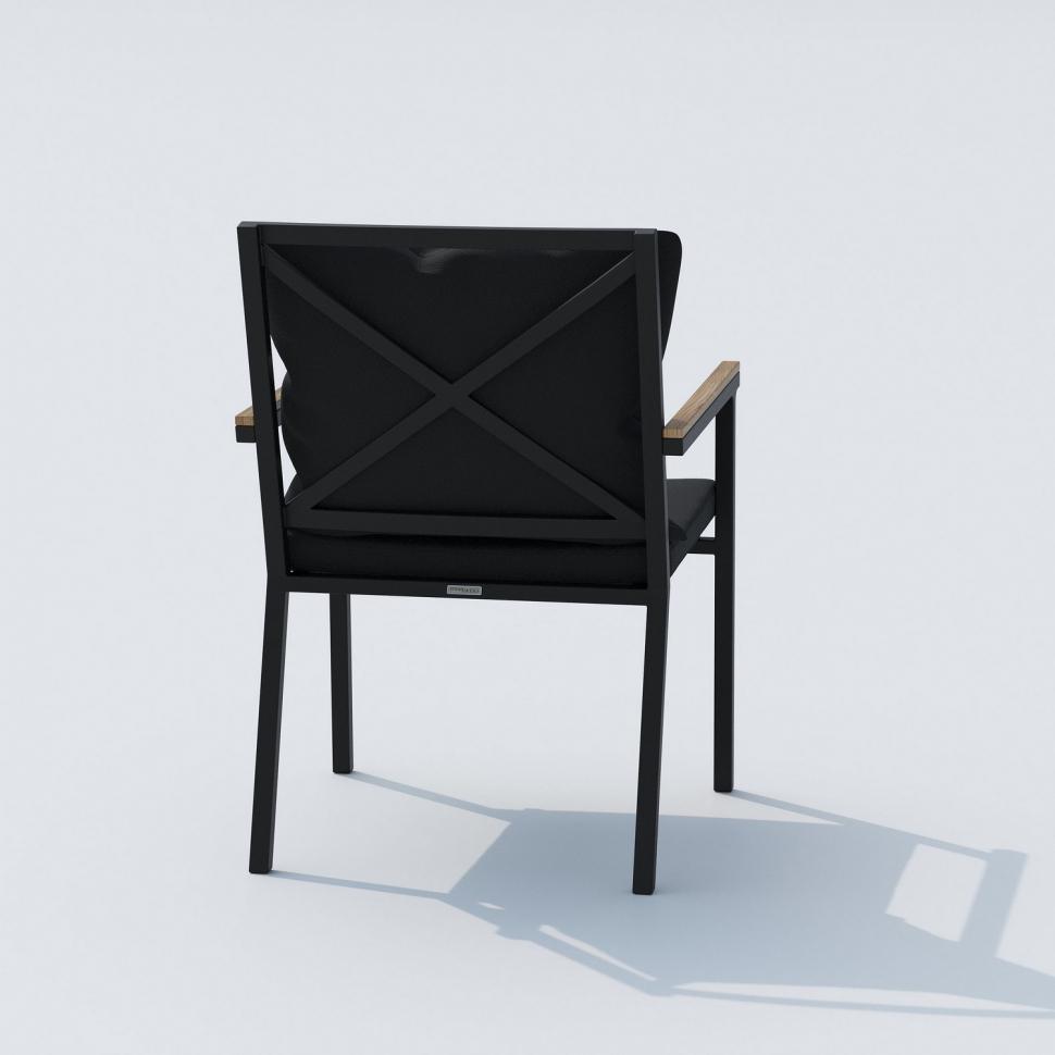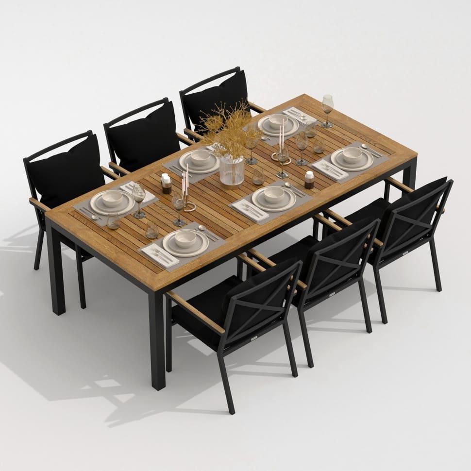 Каркас мебели выполнен из всесезонного алюминия с порошковым покрытием темно-серого цвета, подлокотники стульев декорированы вставками из тика, подушки сидений и спинок обшиты уличной тканью черного цвета с водоотталкивающей пропиткой, толщина подушек 5 см, съемные чехлы на "молнии", столешница обеденного стола изготовлена из тика