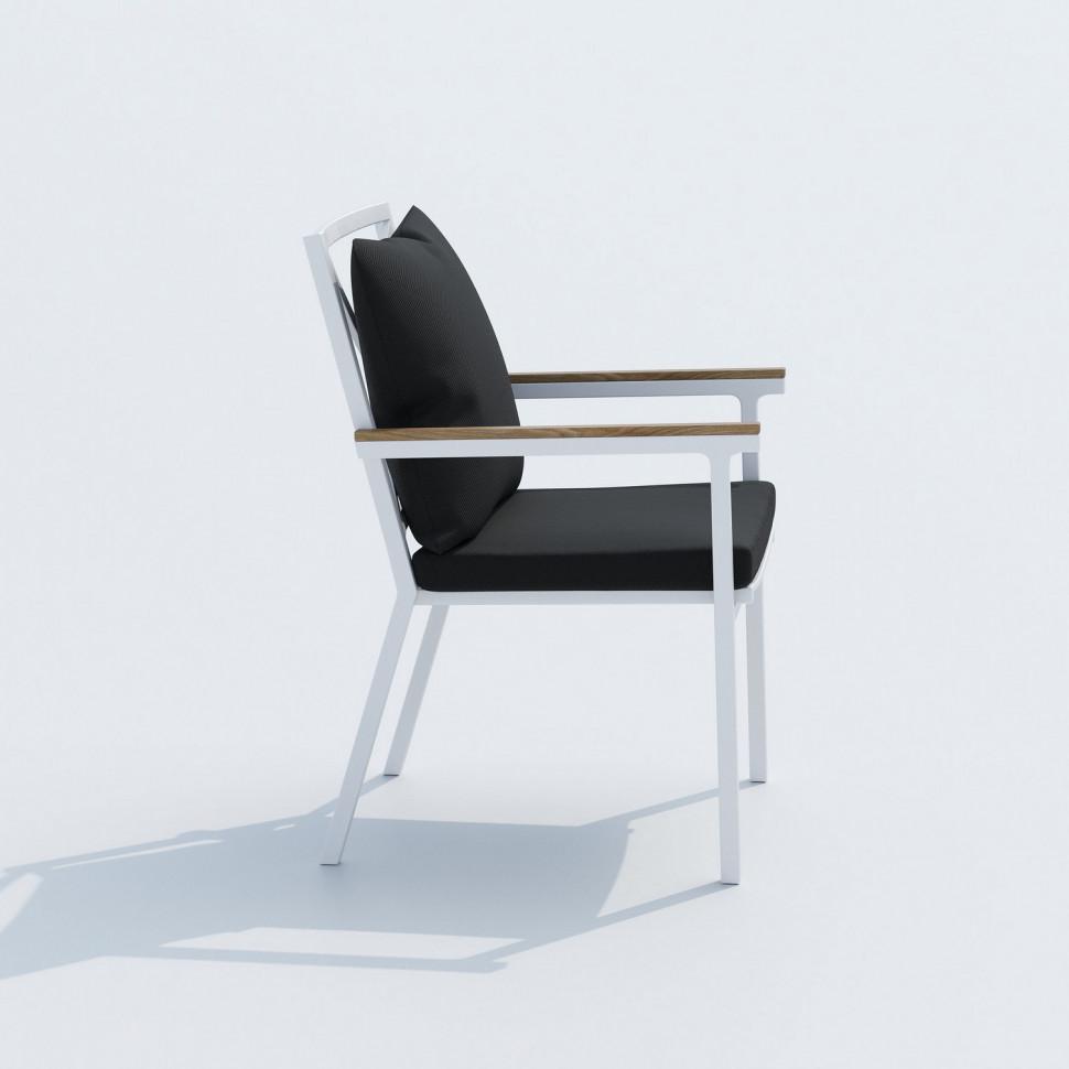 Каркас мебели выполнен из всесезонного алюминия с порошковым покрытием белого цвета, подлокотники стульев декорированы вставками из тика, подушки сидений и спинок обшиты уличной тканью темно-серого цвета с водоотталкивающей пропиткой, толщина подушек 5 см, съемные чехлы на "молнии", столешница обеденного стола изготовлена из тика