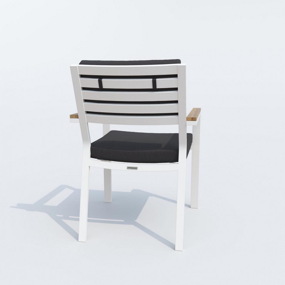 Каркас мебели выполнен из всесезонного алюминия с порошковым покрытием белого цвета, подлокотники стульев декорированы вставками из тика, подушки сидений обшиты уличной тканью темно-серого цвета с водоотталкивающей пропиткой, толщина подушек 5 см, чехол съемный на "молнии", столешница обеденного стола изготовлена из тика