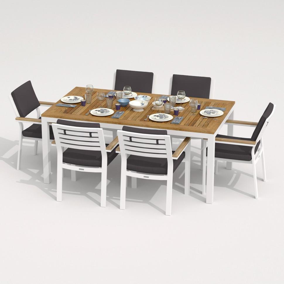 Каркас мебели выполнен из всесезонного алюминия с порошковым покрытием белого цвета, подлокотники стульев декорированы вставками из тика, подушки сидений обшиты уличной тканью темно-серого цвета с водоотталкивающей пропиткой, толщина подушек 5 см, чехол съемный на "молнии", столешница обеденного стола изготовлена из тика
