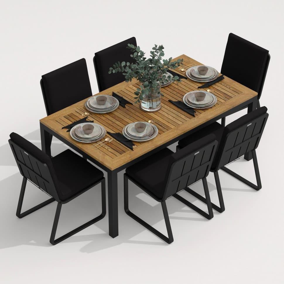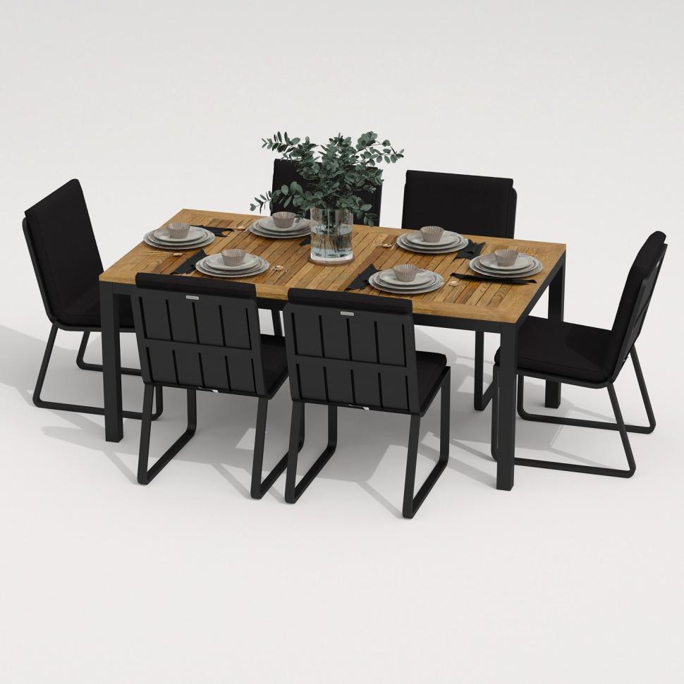 Каркас мебели выполнен из всесезонного алюминия с порошковым покрытием темно-серого цвета, подушки спинок и сидений стульев обшиты уличной тканью черного цвета с водоотталкивающей пропиткой, толщина подушек 5 см, чехол съемный на "молнии", столешница обеденного стола изготовлена из тика.