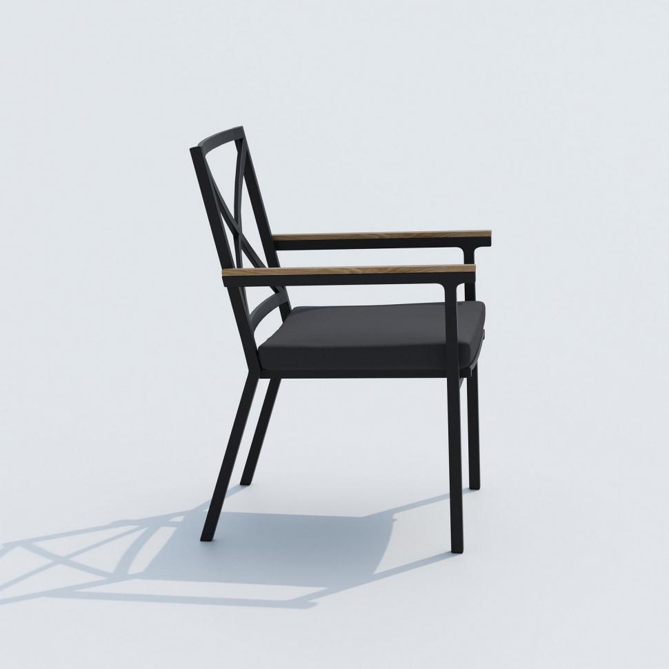 Каркас мебели выполнен из всесезонного алюминия с порошковым покрытием темно-серого цвета, подлокотники стульев декорированы вставками из тика, подушки сидений обшиты уличной тканью цвета антрацит с водоотталкивающей пропиткой, толщина подушек 5 см, чехол съемный на "молнии", столешница обеденного стола изготовлена из тика.