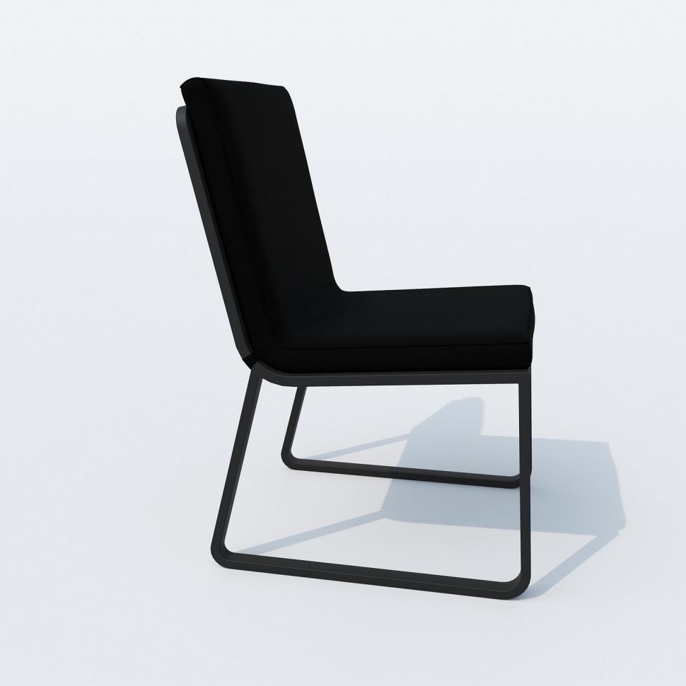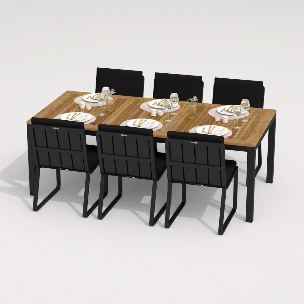 Каркас мебели выполнен из всесезонного алюминия с порошковым покрытием темно-серого цвета, подушки спинок и сидений стульев обшиты уличной тканью черного цвета с водоотталкивающей пропиткой, толщина подушек 5 см, чехол съемный на "молнии", столешница обеденного стола изготовлена из тика.