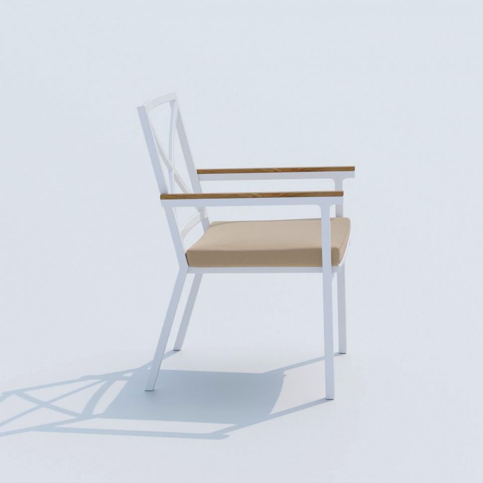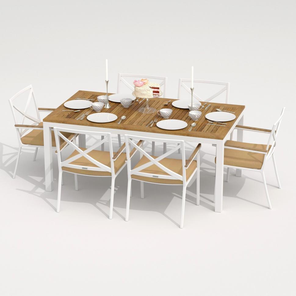 Каркас мебели выполнен из всесезонного алюминия с порошковым покрытием белого цвета, подлокотники стульев декорированы вставками из тика, подушки сидений обшиты уличной тканью бежевого цвета с водоотталкивающей пропиткой, толщина подушек 5 см, чехол съемный на "молнии", столешница обеденного стола изготовлена из тика.