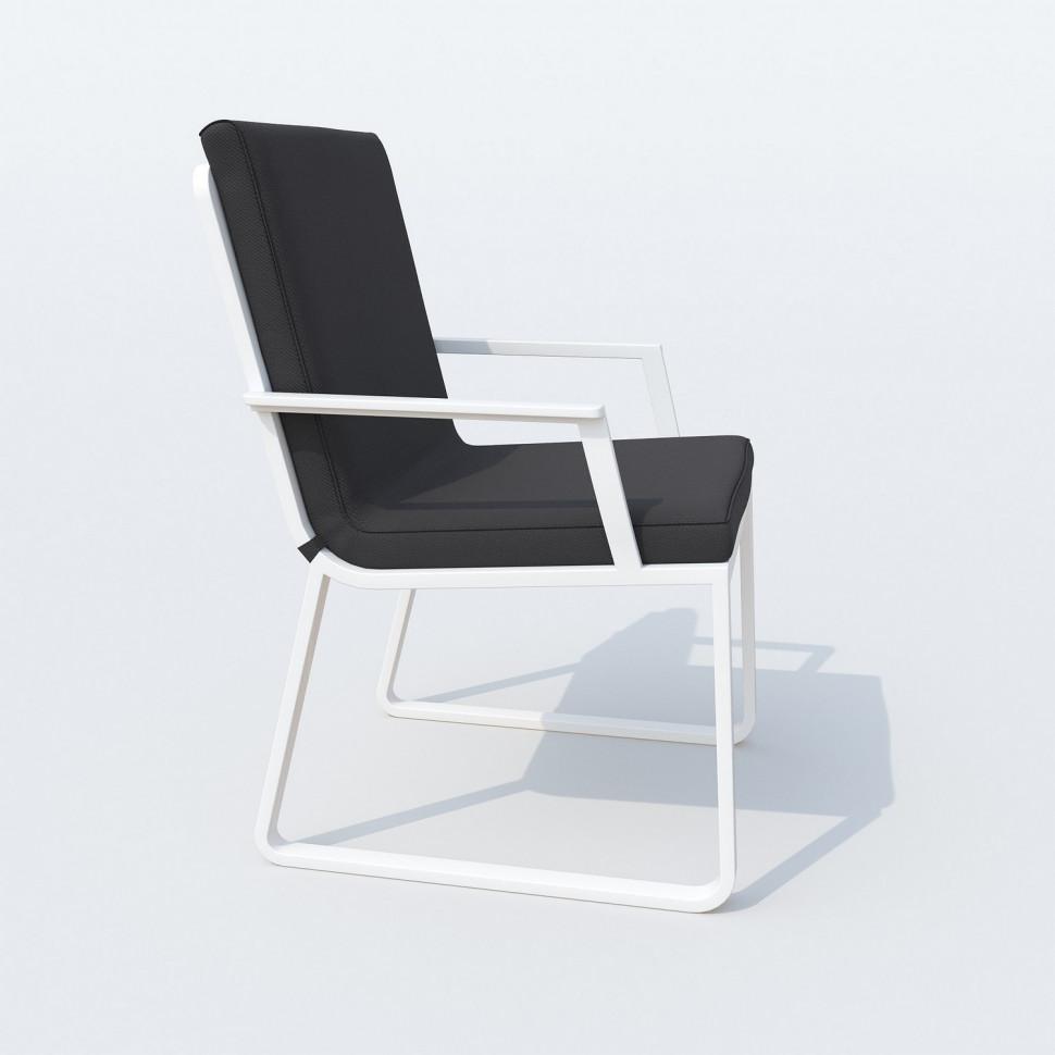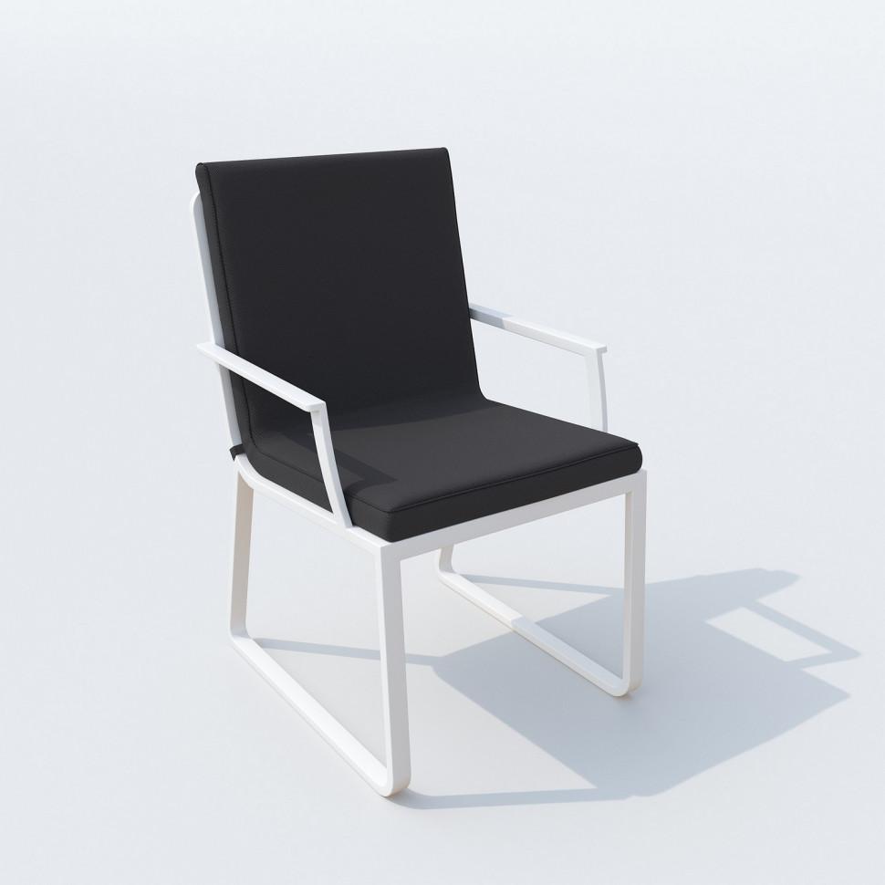 Каркас мебели выполнен из всесезонного алюминия с порошковым покрытием белого цвета, подушки спинок и сидений стульев обшиты уличной тканью темно-серого цвета с водоотталкивающей пропиткой, толщина подушек 5 см, чехол съемный на "молнии", столешница обеденного стола изготовлена из тика.