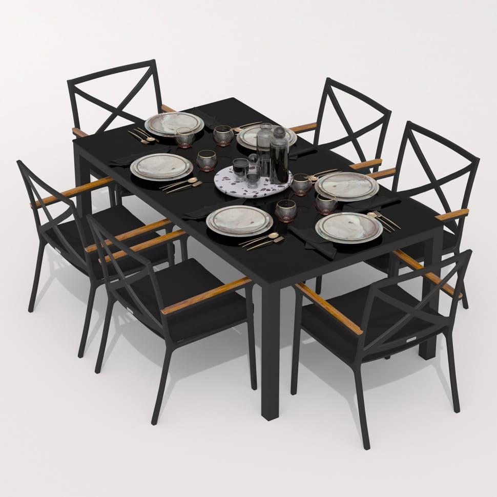Каркас мебели выполнен из всесезонного алюминия с порошковым покрытием темно-серого цвета (карбон), подлокотники стульев декорированы вставками из тика, подушки сидений обшиты уличной тканью черного цвета с водоотталкивающей пропиткой, толщина подушек 5 см, чехол съемный на "молнии", столешница обеденного стола глянцевая, изготовлена из закаленного стекла толщиной 5 мм, с нанесением черного цвета с помощью шелкотрафаретной печати.