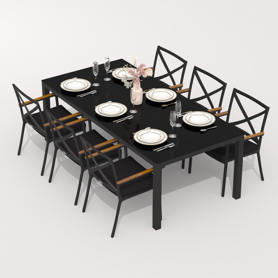 Каркас мебели выполнен из всесезонного алюминия с порошковым покрытием темно - серого цвета (карбон), подлокотники стульев декорированы вставками из тика, подушки сидений обшиты уличной тканью черного цвета с водоотталкивающей пропиткой, толщина подушек 5 см, чехол съемный на "молнии", столешница обеденного стола глянцевая, изготовлена из закаленного стекла толщиной 5 мм, с нанесением черного цвета с помощью шелкотрафаретной печати.