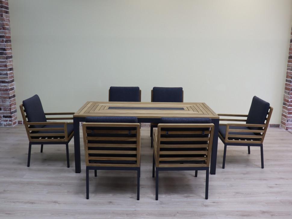 Каркас мебели выполнен из всесезонного алюминия с порошковым покрытием темно-серого цвета, подлокотники и спинки стульев изготовлены из натурального тика, подушки сидений и спинок обшиты премиальной уличной тканью темно-серого цвета с водоотталкивающей пропиткой, толщина подушек 5 см, съемные чехлы на "молнии", столешница обеденного стола изготовлена из натурального тика с керамической вставкой для горячего по центру. Элегантная классика в новом авторском прочтении. В коллекции гармонично сочетается натуральный цвет тикового дерева и строгие формы подножья из алюминия, окрашенного порошковой краской в благородный серый цвет. Мебель соединяет в себе черты модерна с нотками кантри. Простые и четкие линии создают легкий и в тоже время выразительный образ. Комплектация: стол обеденный 1 шт, стул обеденный 6 шт