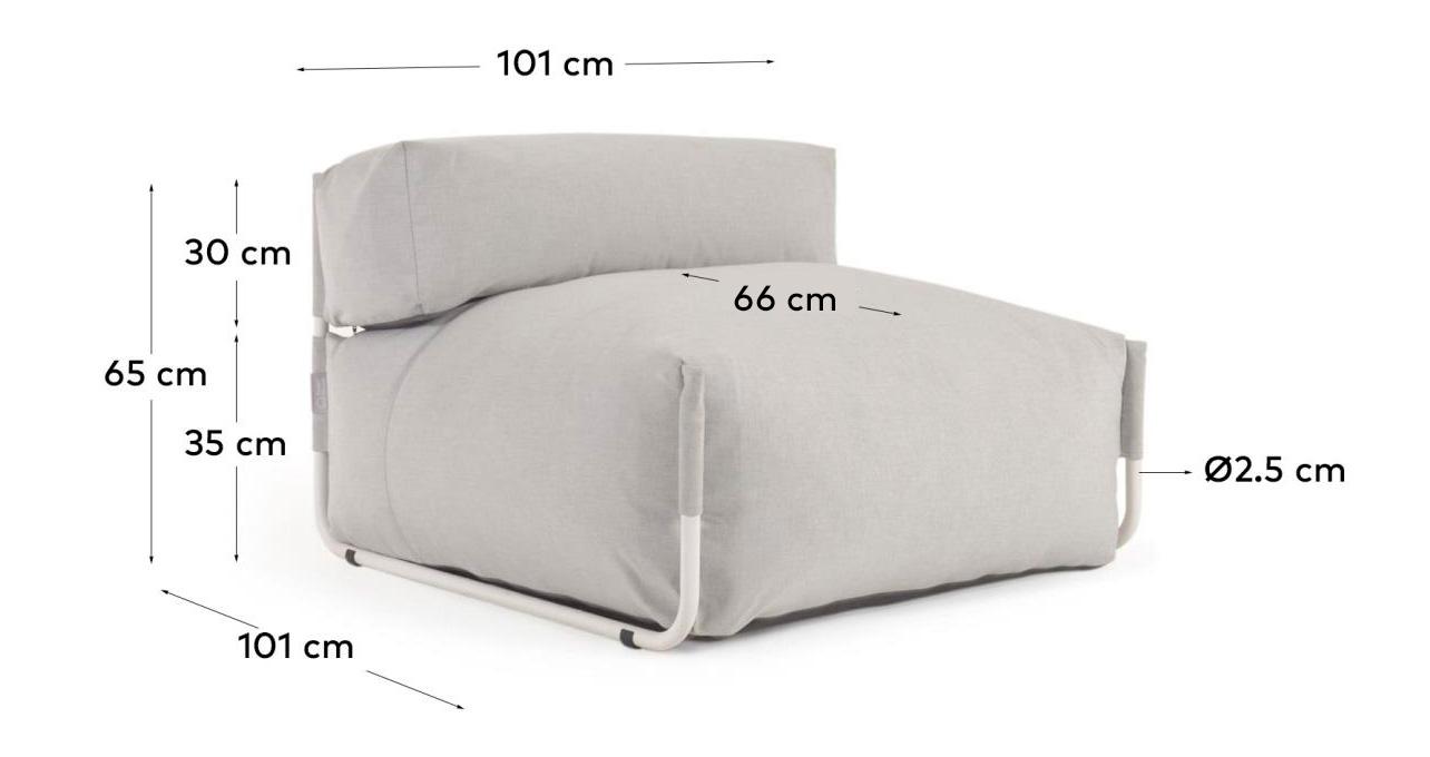 Пуф Square от фабрики La Forma (ex Julia Grup) – запредельная высота для максимального комфорта. Пуф Square поможет вам создать идеальную зону отдыха. Его модульная конструкция и универсальный цвет легко подстроятся под любой уличный интерьер. А непромокаемая обивка обеспечит комфорт и полное спокойствие в разных неожиданных ситуациях. Создайте свою идеальную зону отдыха, комбинируя различные модули и цвета. И пусть прохладительные напитки будут рядом. Это не страшно! Пуф имеет модульную конструкцию, состоящую из металлического каркаса и двух подушек. Каркас трубчатый, толщиной 2,5 см. Он окрашен в белый цвет матовой порошковой краской. Покрытие защищает металл от появления коррозии, придает изделию эстетичный вид. Сверху на каркас поочередно одеваются подушки - сиденье высотой 35 см и спинка высотой 30 см. Обивка – 100% износостойкий полиэстер плотностью 190 г/м2. Ткань устойчива к влаге и ультрафиолету, легко чистится от загрязнений. Чехлы съемные, их можно стирать в машинке, соблюдая температурный режим в 30 градусов. Наполнитель подушек – шарики из пенопласта. Пенопласт обеспечивает комфорт, не впитывает запахи, хорошо держит форму. Максимальная нагрузка на пуф не должна превышать 150 кг. Размеры: ширина – 101 см, высота – 65 см, глубина – 101 см, глубина сиденья – 97,5 см. Вес изделия – 12,15 кг. В коллекции Square также представлен пуф-шезлонг в аналогичном дизайне. Доступные цвета: бежевый, серый, черный.