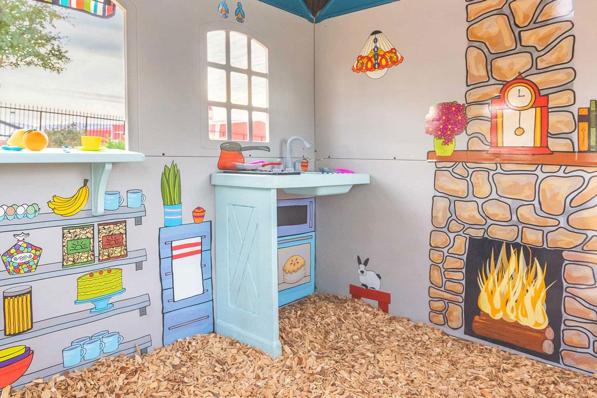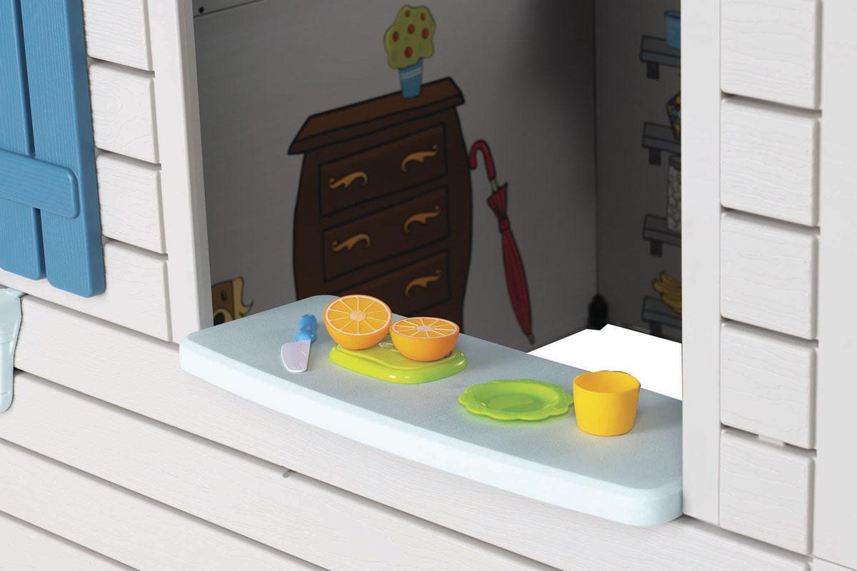 Игровой домик подарит вашему ребенку пространство для творчества, с помощью многоразовых наклеек интерьер в доме можно менять. Он сможет сам выбрать где разместить стул, стол, камин, книжную полку и многое другое. Дайте волю воображению вашего ребенка, когда он подбирает аксессуары по своему вкусу. В комплекте есть дверь с дверным звонком, витрины с полками и раковина с игровой посудой и едой.