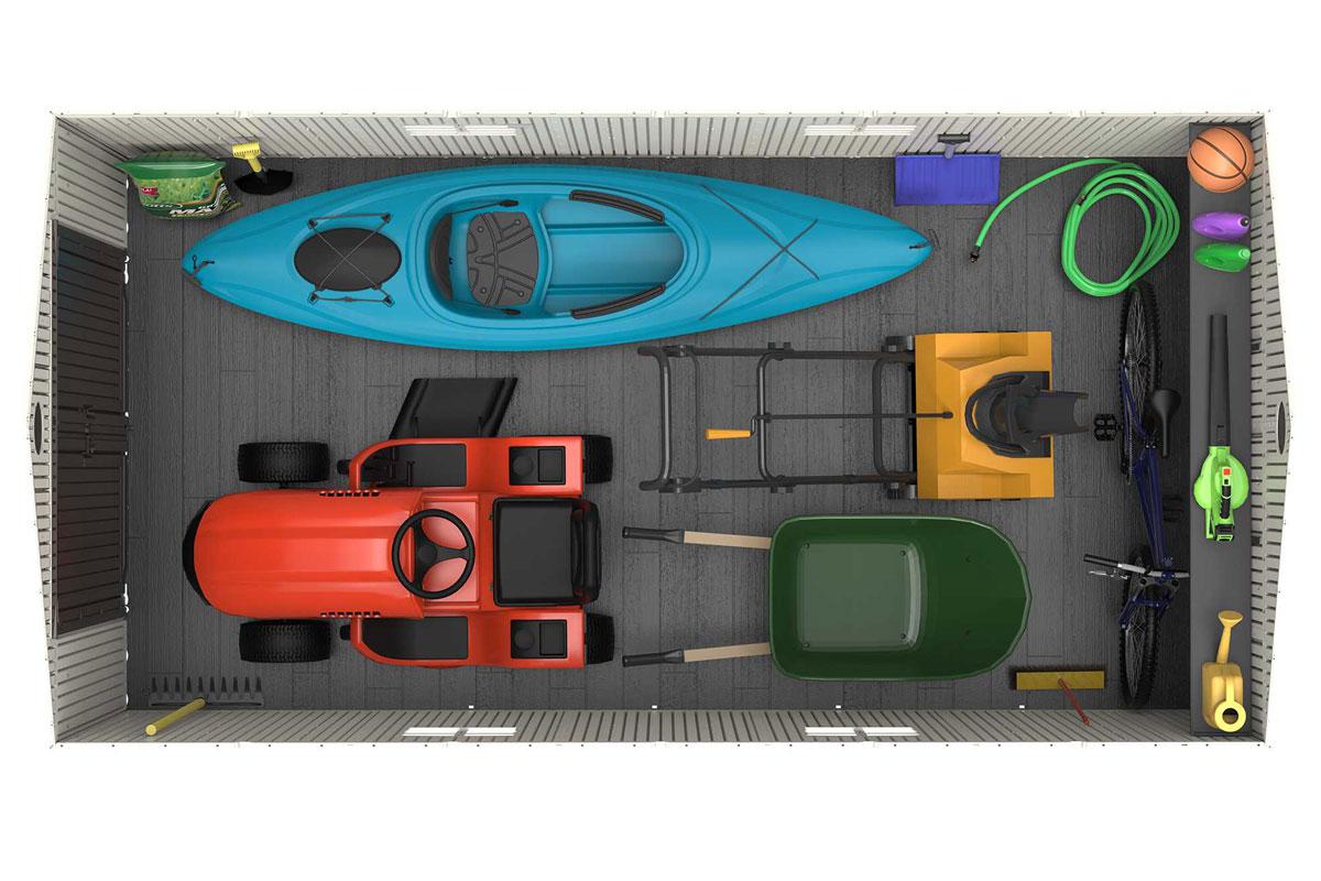 Пластиковый сарай Woodlook 15`x 8`самый большой из представленных, отличается вместимостью и двойным входом, что обеспечит легкую доступность к хранимым вещам, позволит зонировать пространство сарая под ваши нужды и подарит вам безграничные возможности хранения, поместиться всё: