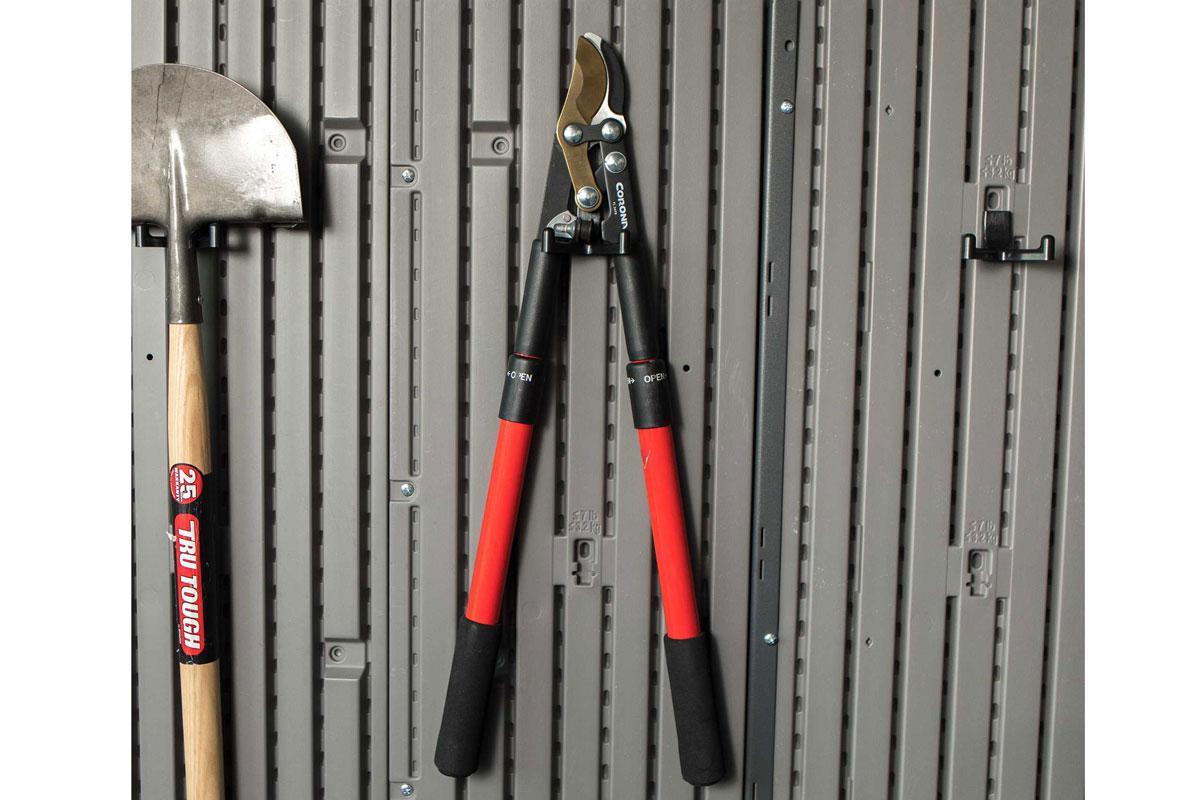 Хранение хозинвентаря - самое популярное применение. Грабли, лопаты, ведра, лейки, шланги, бочки, насосы, лестницы и многое другое найдут свой уютный дом.
