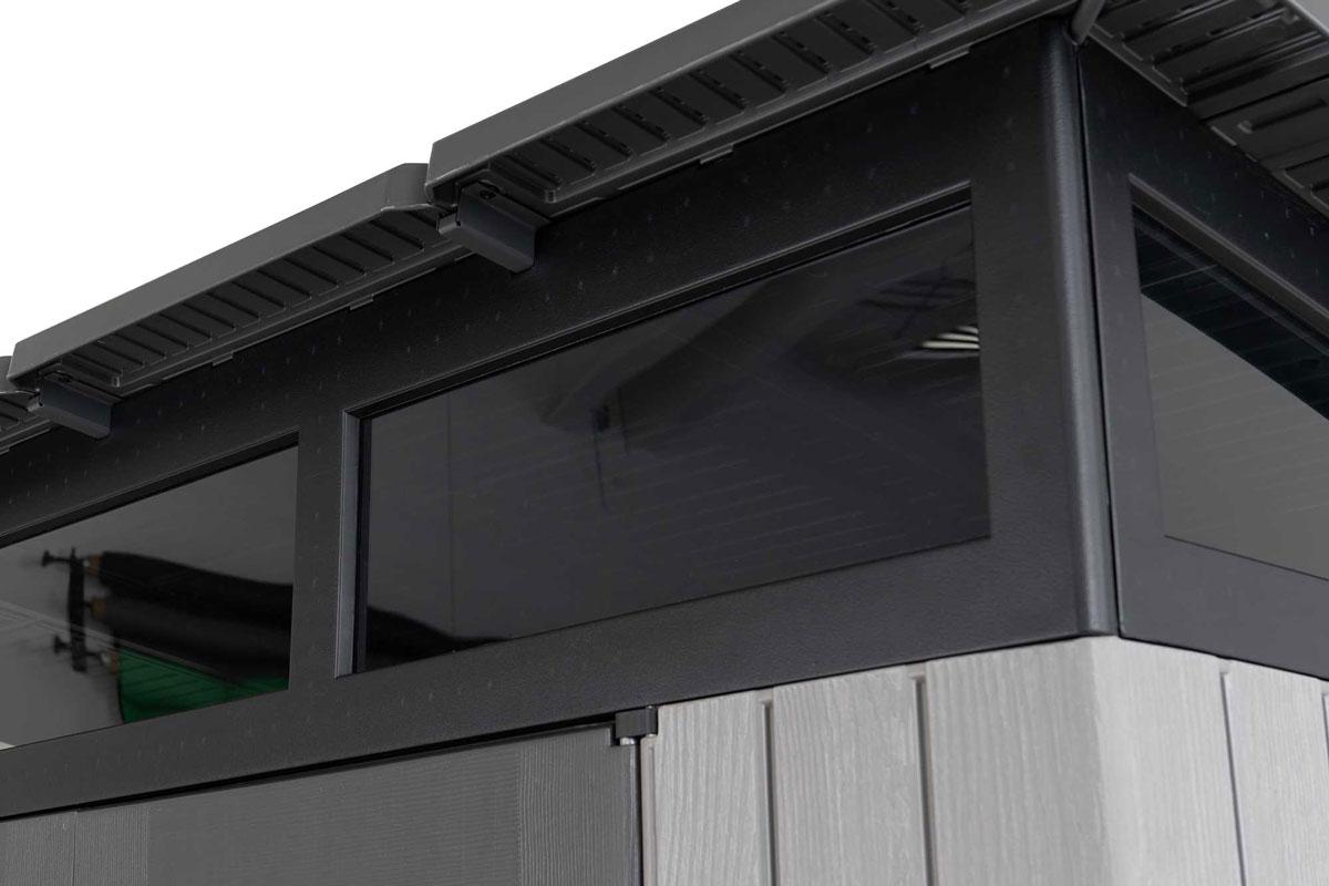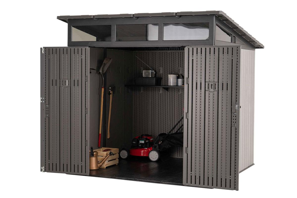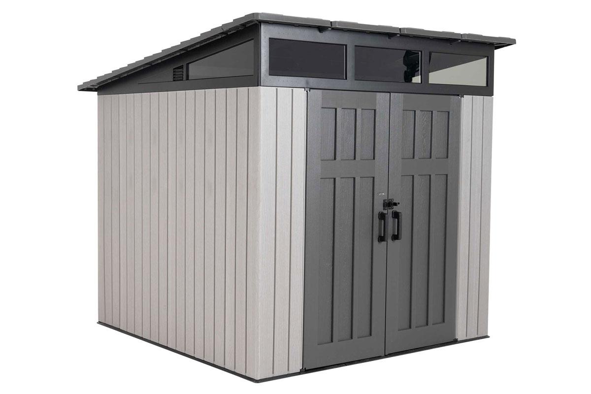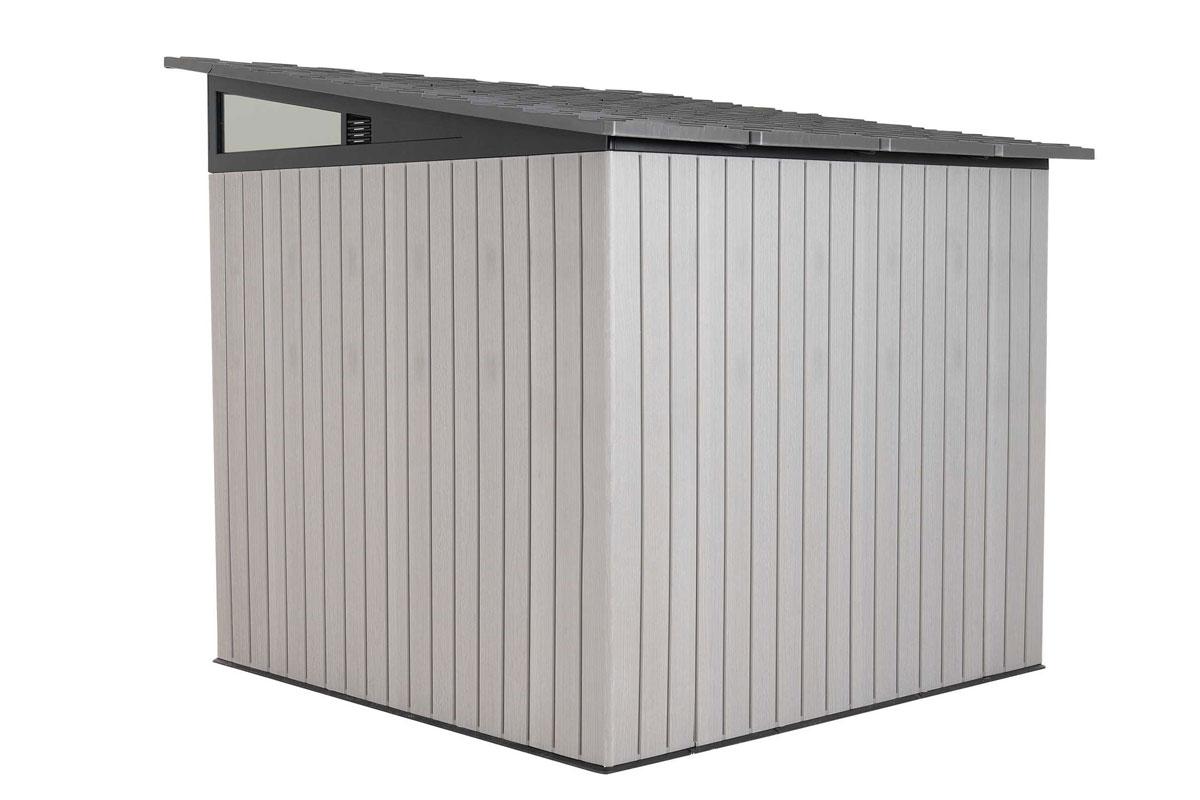 Современный хозяйственный блок LifeTime высокой прочности Woodlook 8,3`x 8,3` с односкатной крышей среднего размера уместит в себя минитрактор и газонокосилку, велосипед и квадроцикл или всю уличную мебель в дождливый день и на зимний период.