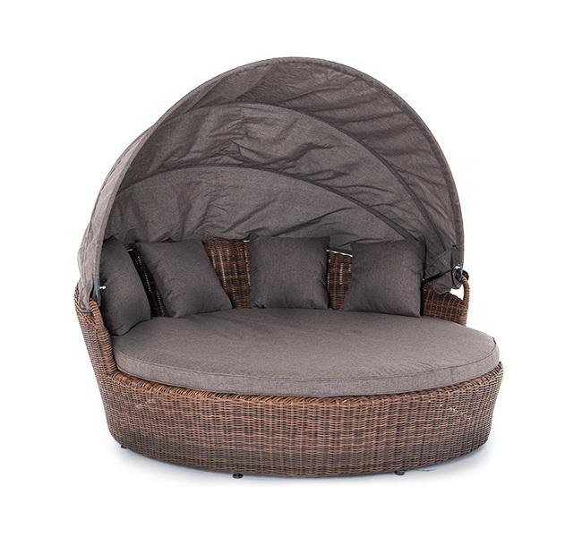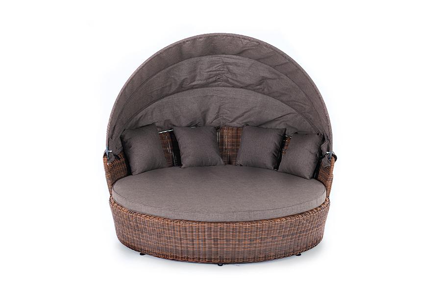 «Стильяно» - кровать из искусственного ротанга круглой формы. Она идеально подойдет для использования на открытом воздухе, в том числе и возле бассейна. Данная модель имеет в основании прочный алюминиевый каркас, оплетенный вручную круглым ротангом коричневого цвета и оснащена регулируемым козырьком, который ограничивает попадание солнечных лучей. Выполнен из водостойкой полиэфирной ткани. Мягкий матрас имеет съёмный чехол серого цвета состоящий из высококачественного полиэстера с водоотталки