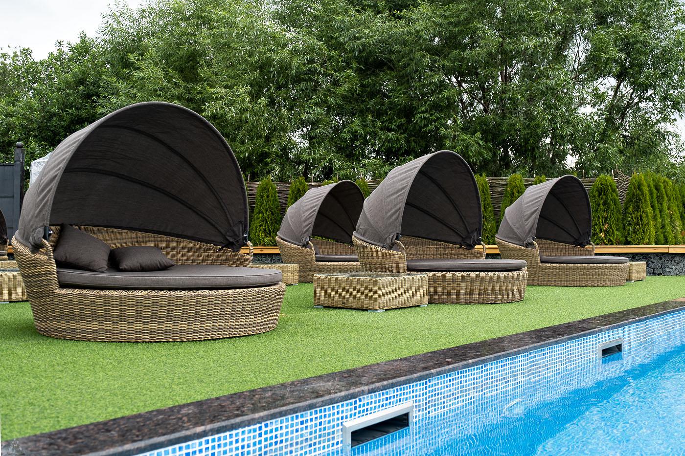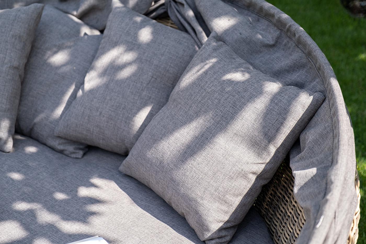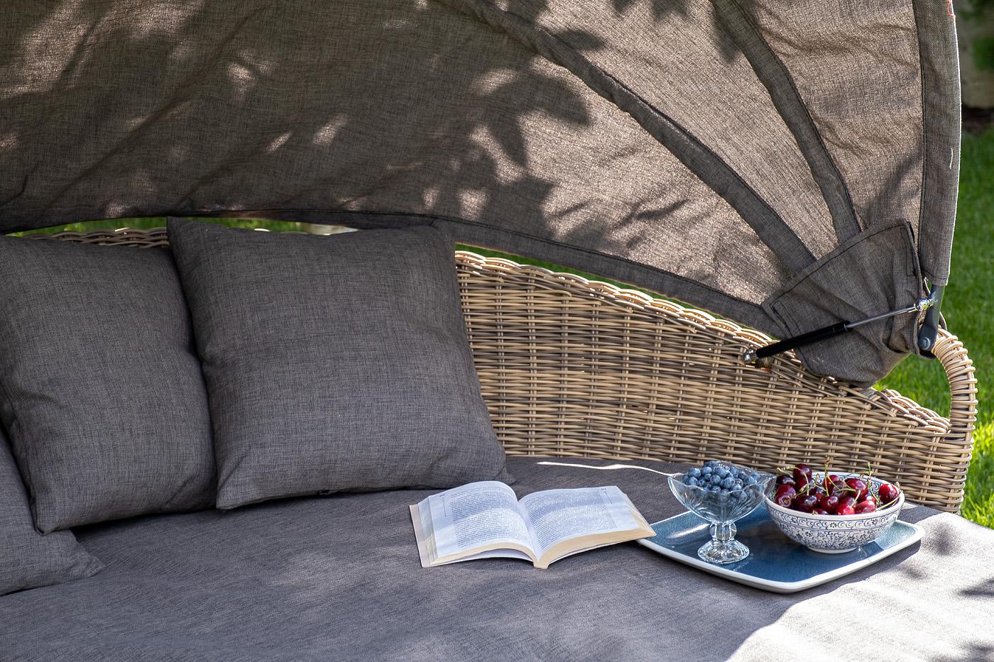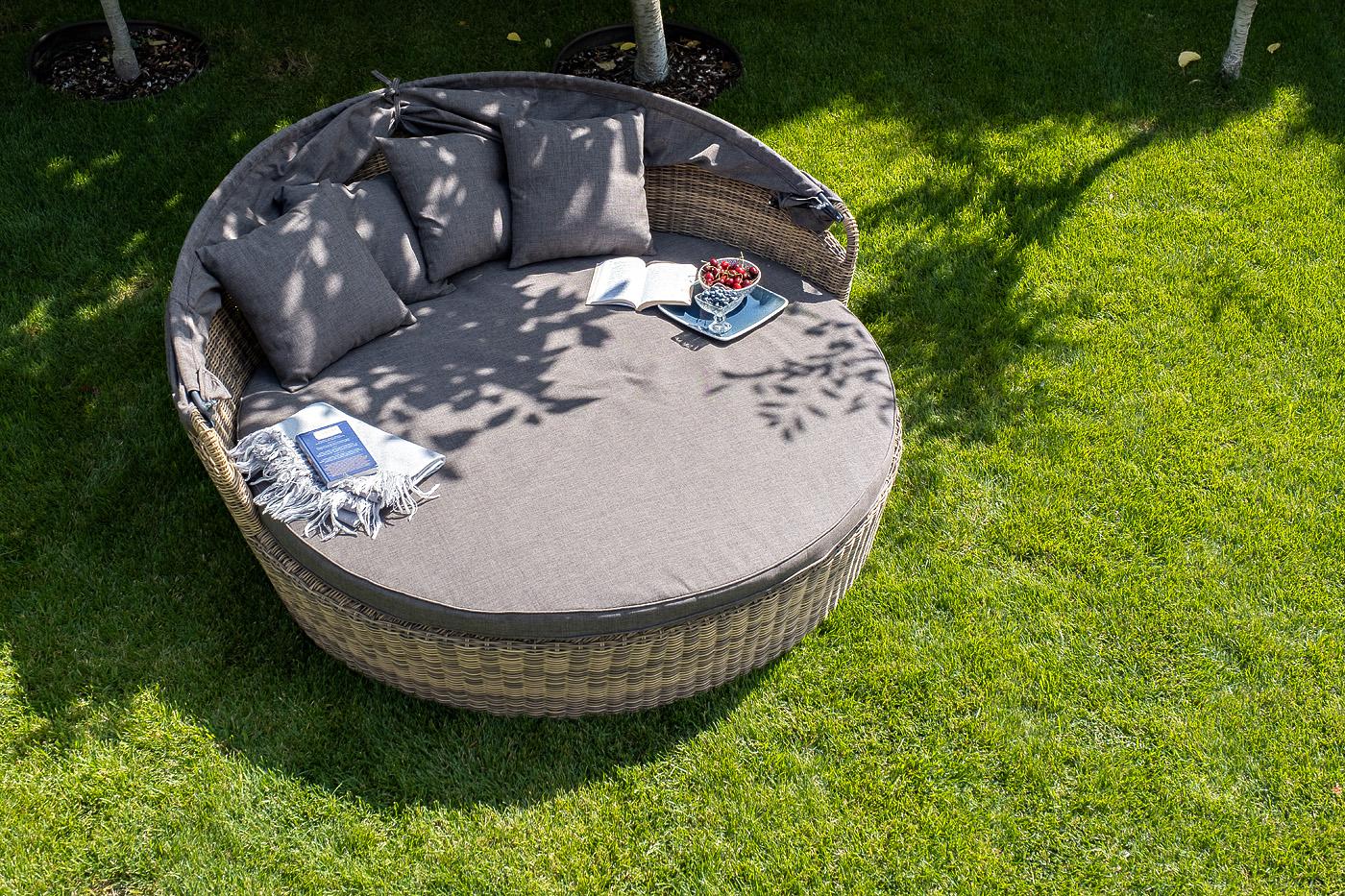 «Стильяно» - кровать из искусственного ротанга круглой формы. Она идеально подойдет для использования на открытом воздухе, в том числе и возле бассейна. Имеет соломенный оттенок. Данная модель имеет в основании прочный алюминиевый каркас, оплетенный вручную круглым ротангом и оснащена регулируемым козырьком, который ограничивает попадание солнечных лучей. Выполнен из водостойкой полиэфирной ткани. Мягкий матрас имеет съёмный чехол серого цвета состоящих из высококачественного полиэстера с вод