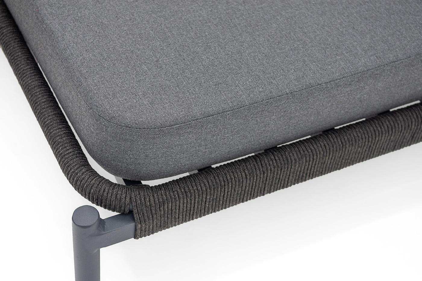 Плетеный лежак «Позитано» с подушками. Идеальное решение для террасы, сада или зоны у бассейна — стильный и функциональный лежак «Позитано». Каркас выполнен из алюминия и покрыт порошковой краской в темно‑серый цвет (RAL7024). Такое исполнение обеспечивает не только эстетичный внешний вид, но и надёжную защиту от коррозии. Оплетка боковин выполнена вручную из роупа — эластичных синтетических лент на основе высокопрочных полиэфирных волокон. Темно‑серый оттенок оплетки гармонично сочетается с к