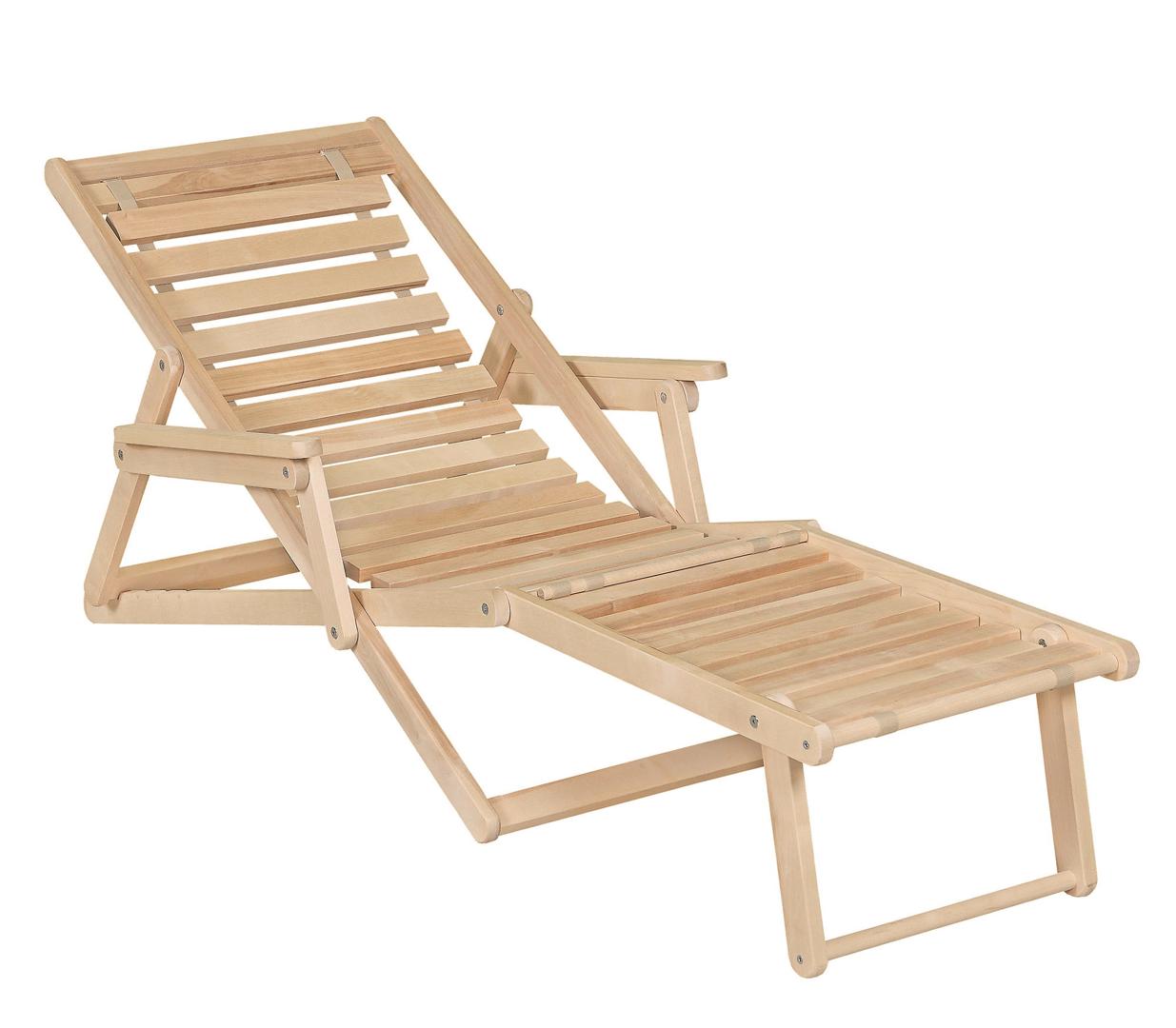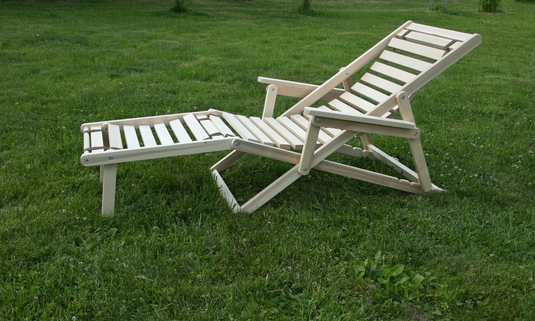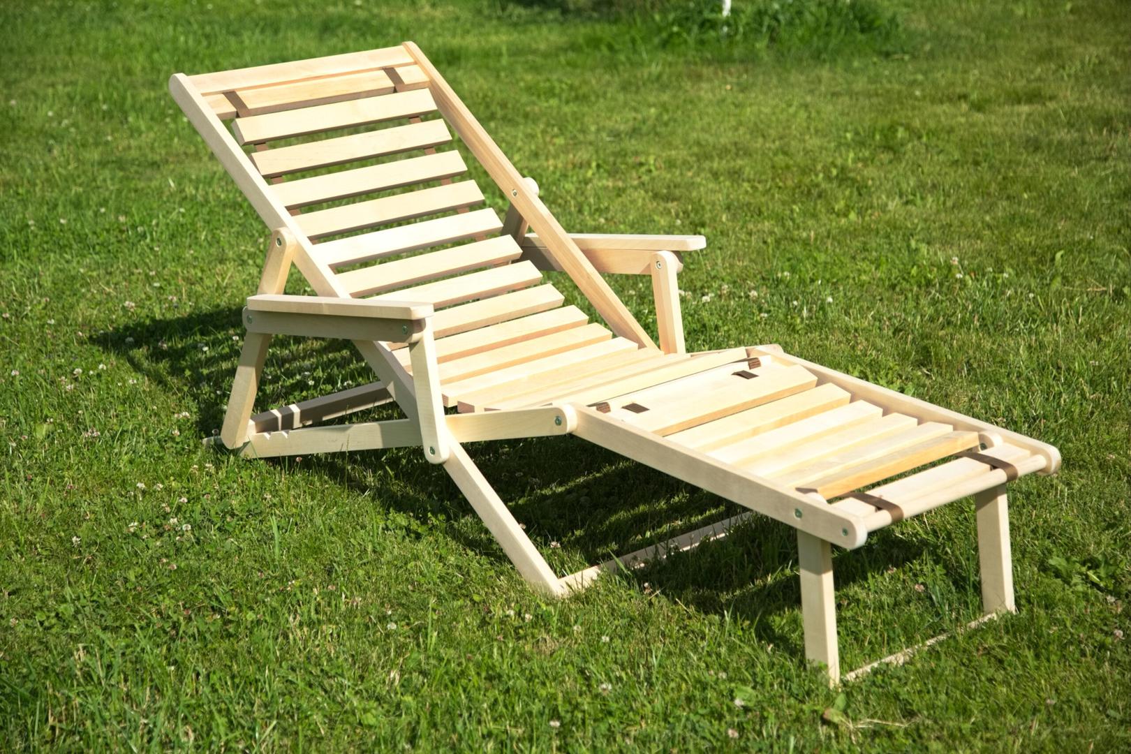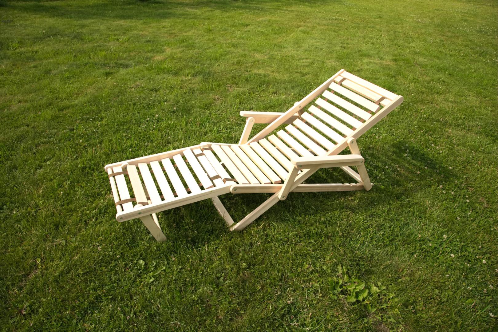 Шезлонг с подлокотниками и подножьем для отдыха на даче, в загородном доме, на террасе, балконе. Легко складывается, не занимает много места. Сиденье из ламелей шириной 45 мм, прочно связанных между собой, принимает форму сидящего. Есть возможность фиксировать наклон спинки в четырёх положениях и подножья в 2 положениях- всего 8 вариантов. Эта модель отлично гармонирует с газоном, бассейном и тёплым солнцем, образуя гармоничное место отдыха. Каркас шезлонга не тонирован, выполнен из шлифованной берёзы первого сорта.
