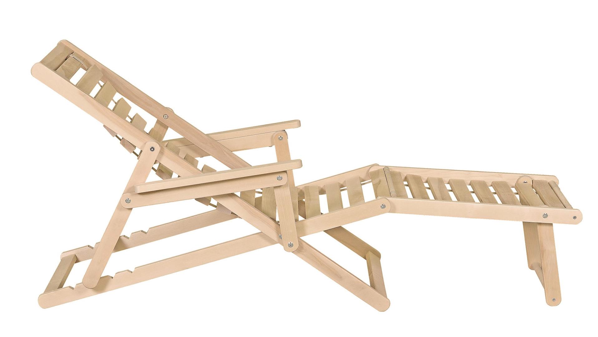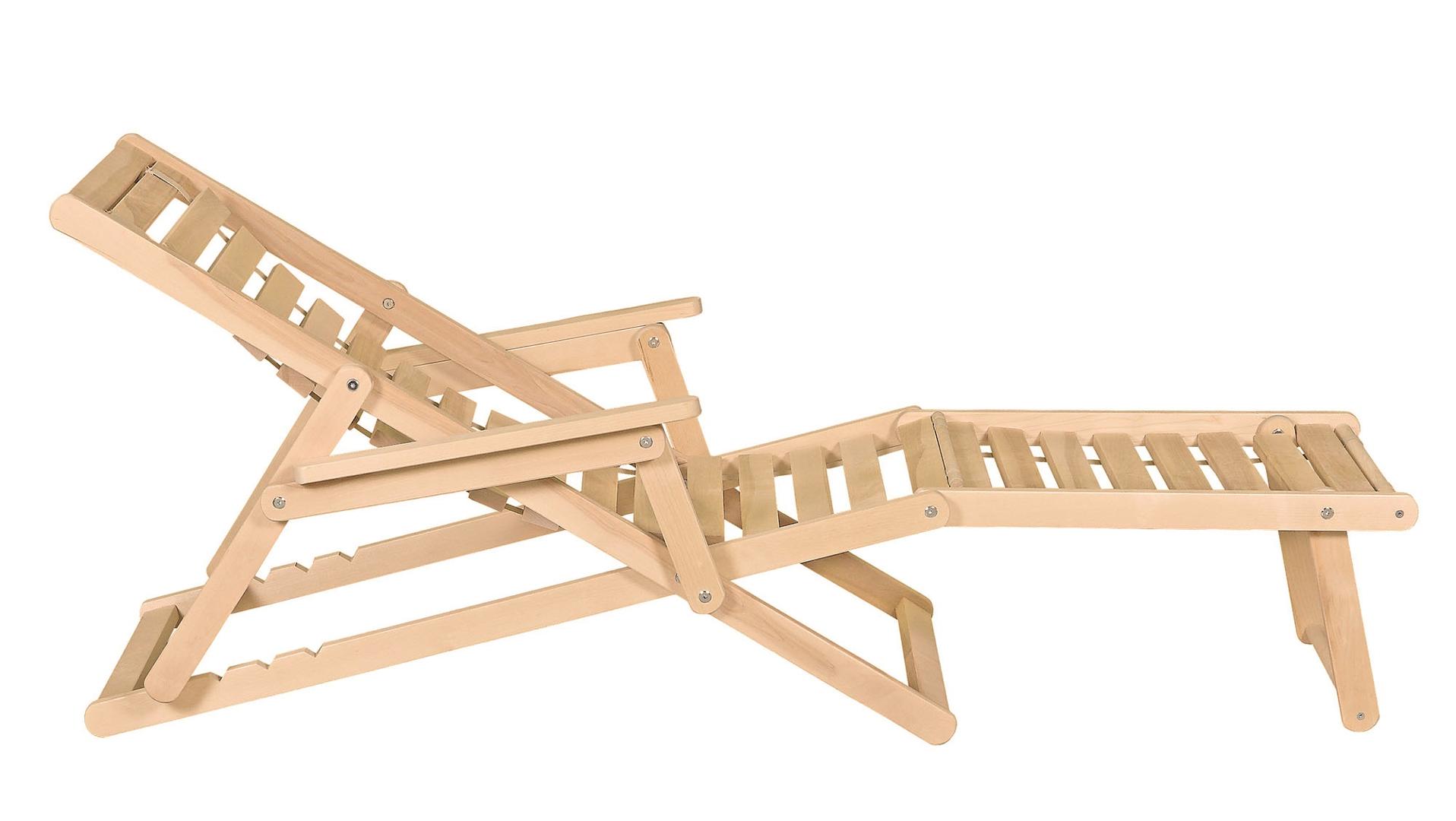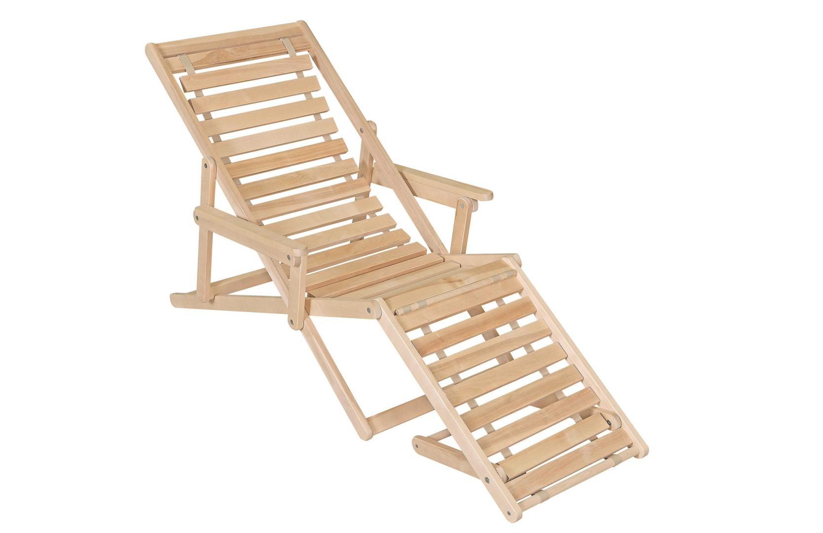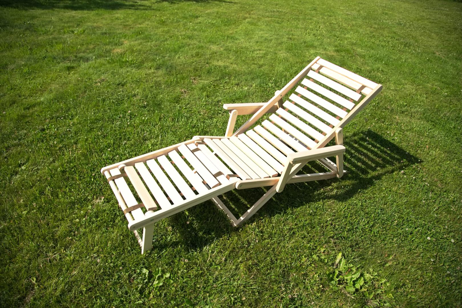 Шезлонг с подлокотниками и подножьем для отдыха на даче, в загородном доме, на террасе, балконе. Легко складывается, не занимает много места. Сиденье из ламелей шириной 45 мм, прочно связанных между собой, принимает форму сидящего. Есть возможность фиксировать наклон спинки в четырёх положениях и подножья в 2 положениях- всего 8 вариантов. Эта модель отлично гармонирует с газоном, бассейном и тёплым солнцем, образуя гармоничное место отдыха. Каркас шезлонга не тонирован, выполнен из шлифованной берёзы первого сорта.