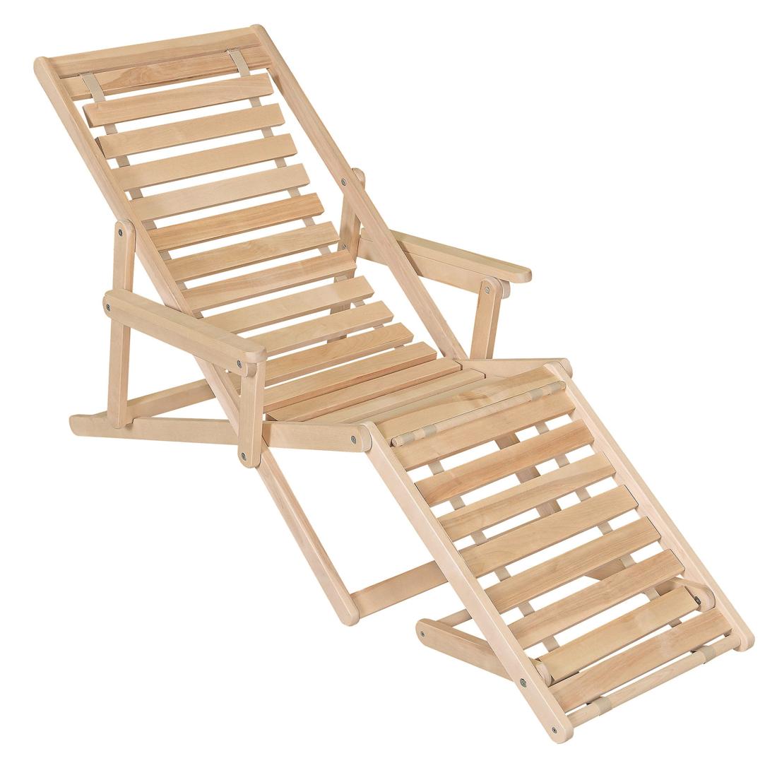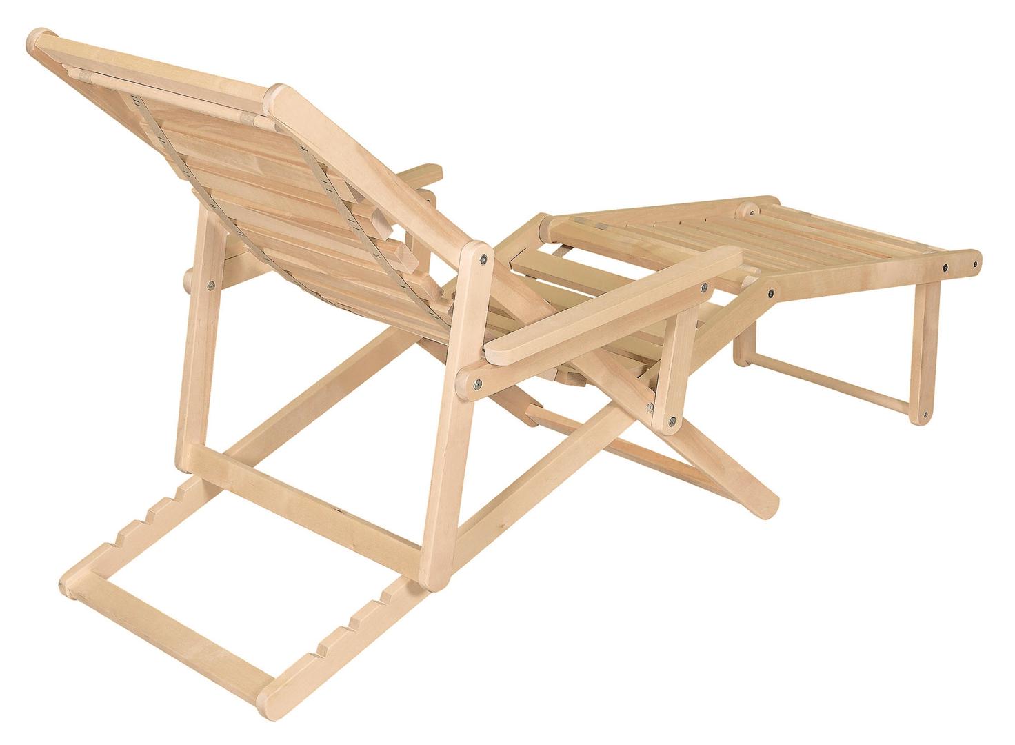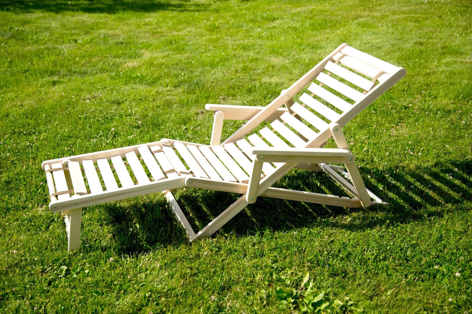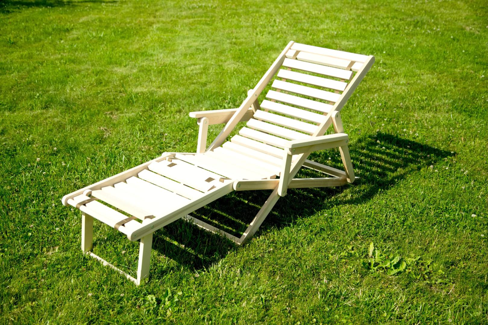 Шезлонг с подлокотниками и подножьем для отдыха на даче, в загородном доме, на террасе, балконе. Легко складывается, не занимает много места. Сиденье из ламелей шириной 45 мм, прочно связанных между собой, принимает форму сидящего. Есть возможность фиксировать наклон спинки в четырёх положениях и подножья в 2 положениях- всего 8 вариантов. Эта модель отлично гармонирует с газоном, бассейном и тёплым солнцем, образуя гармоничное место отдыха. Каркас шезлонга не тонирован, выполнен из шлифованной берёзы первого сорта.