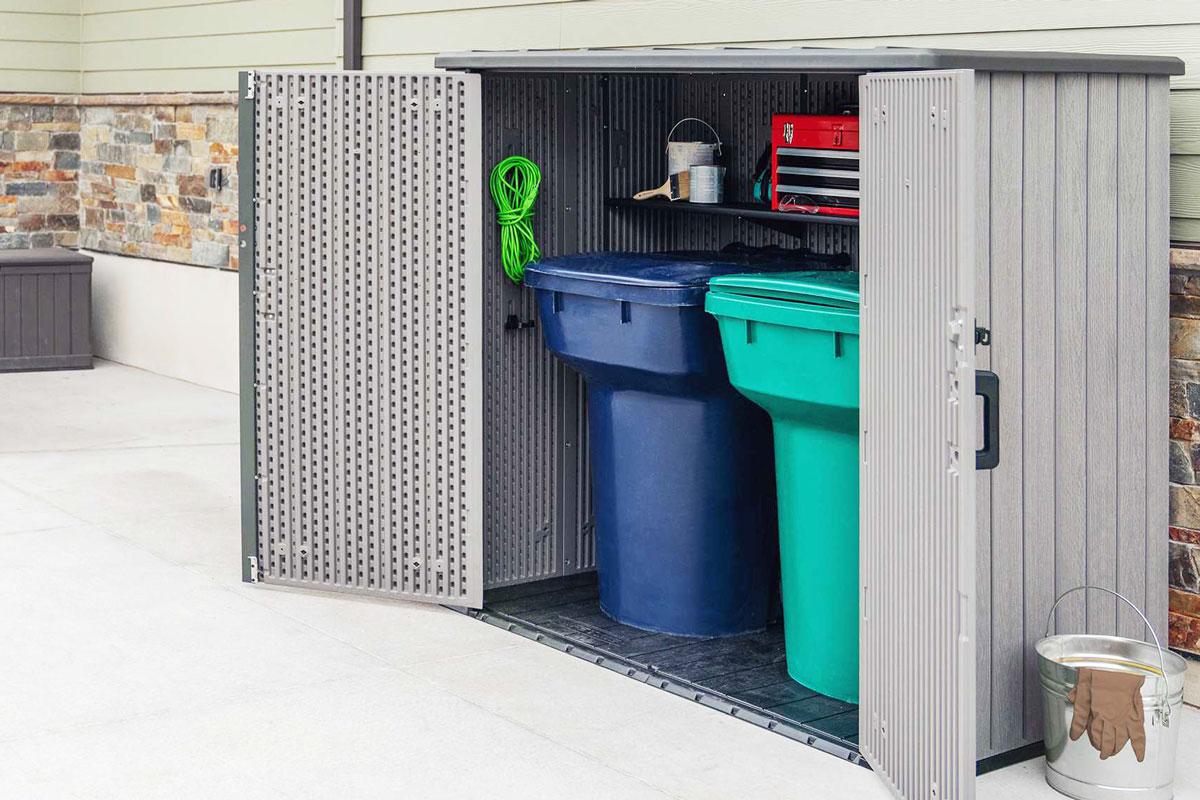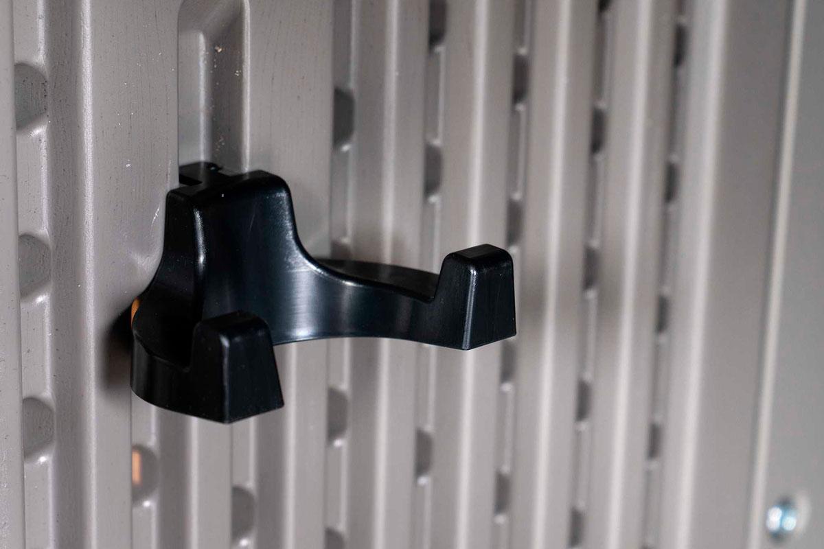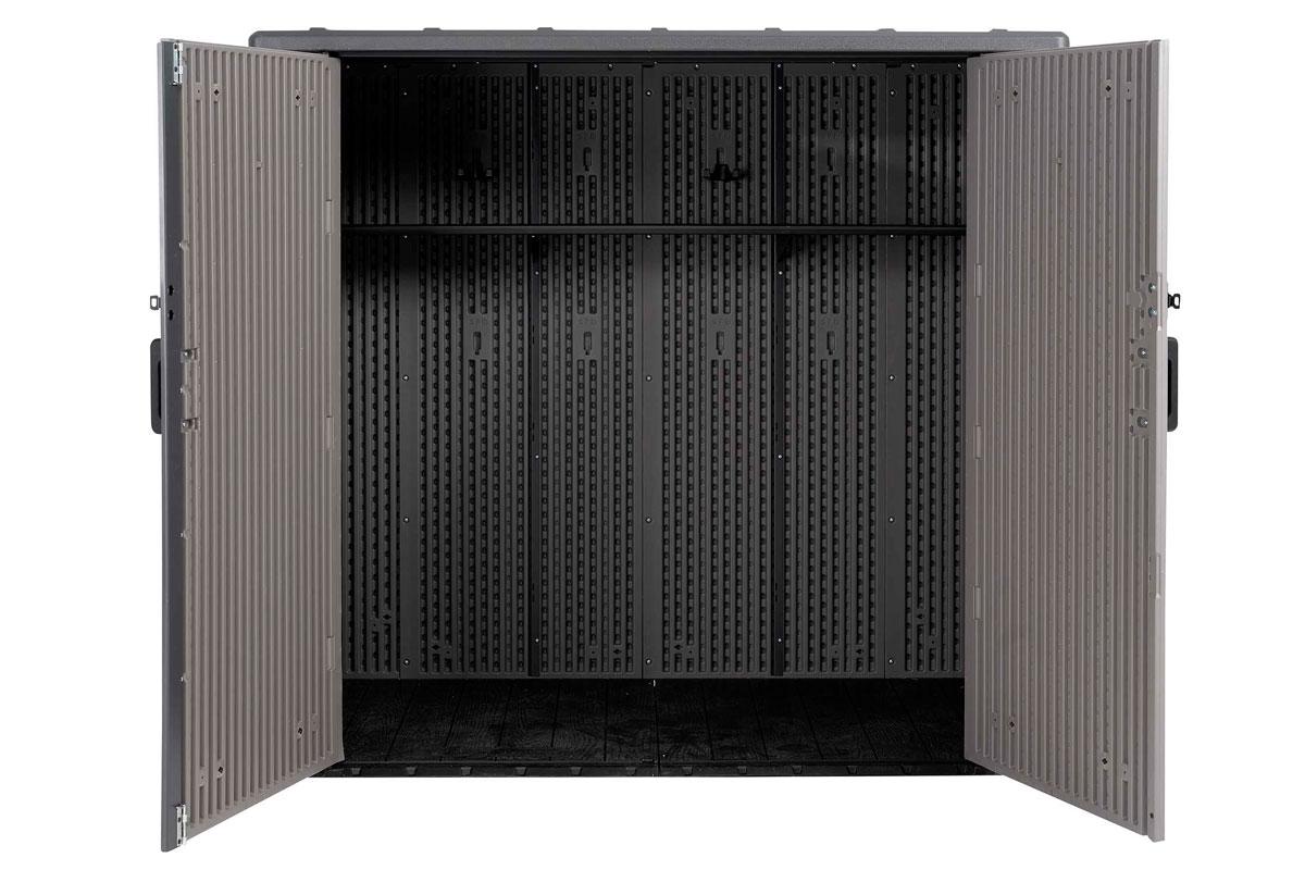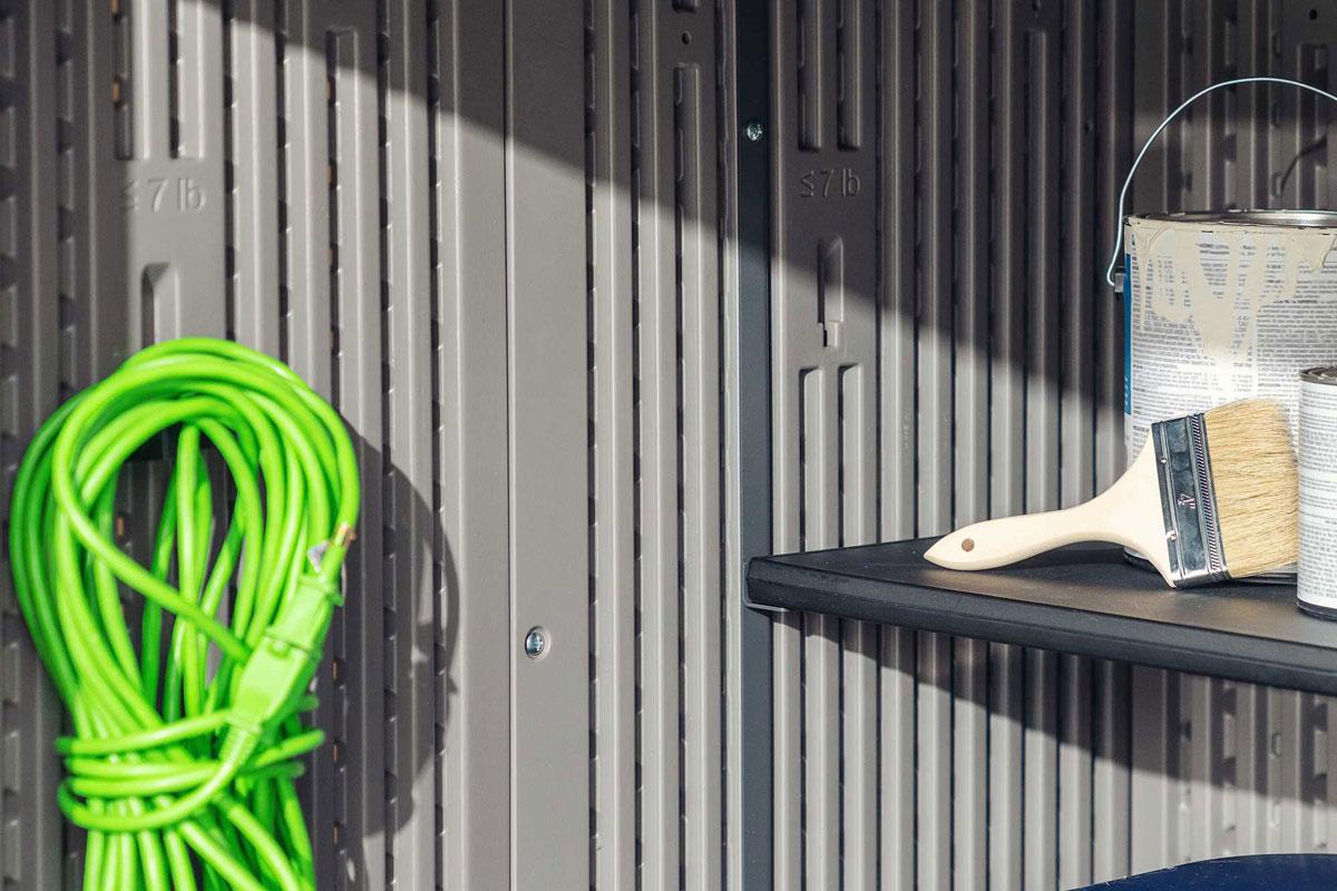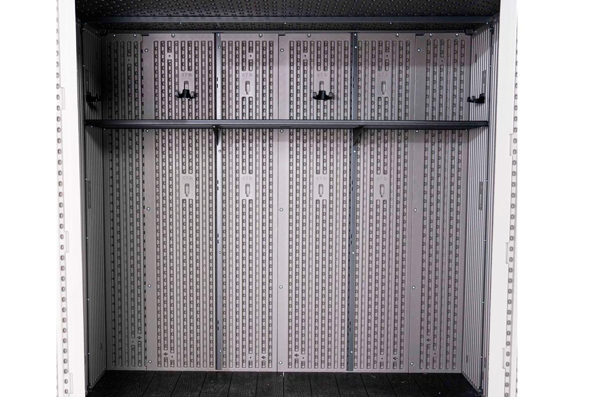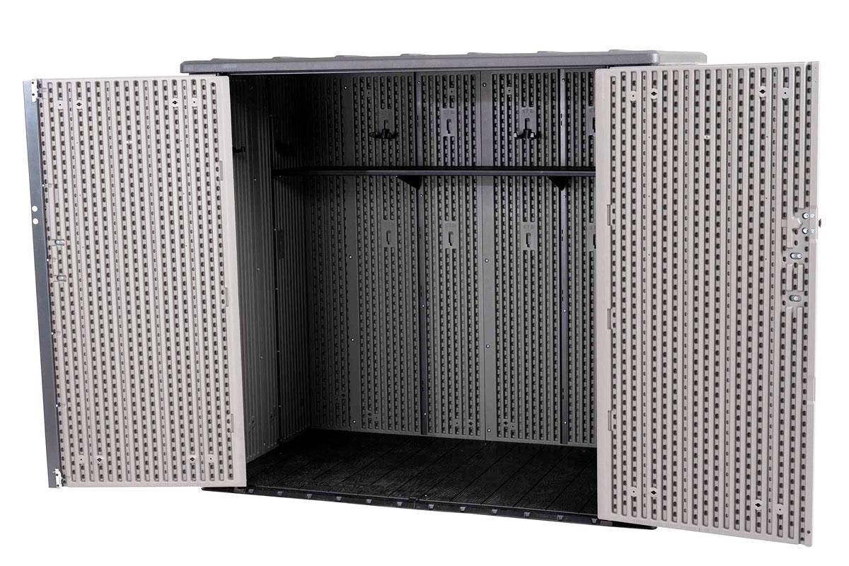 Хозяйственный ящик вместит в себя бытовые мусорные контейнеры, газонокосилки (шириной до 60см) и велосипеды, он также укомплектован стеллажами и съемными настенными крючками для небольших предметов, таких как ручной инструмент, шнуры питания, лопаты, грабли.