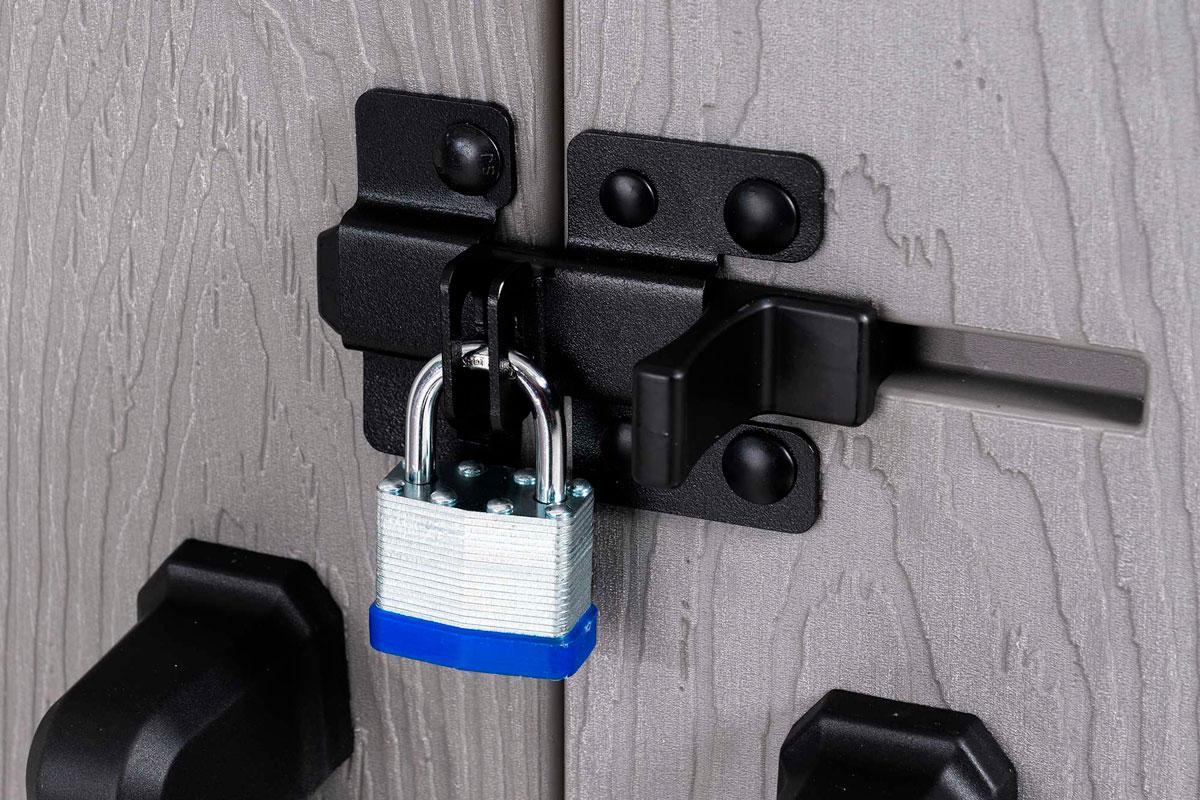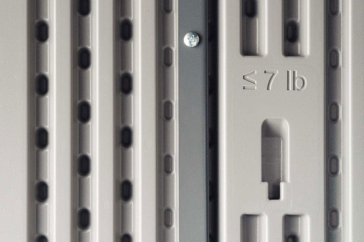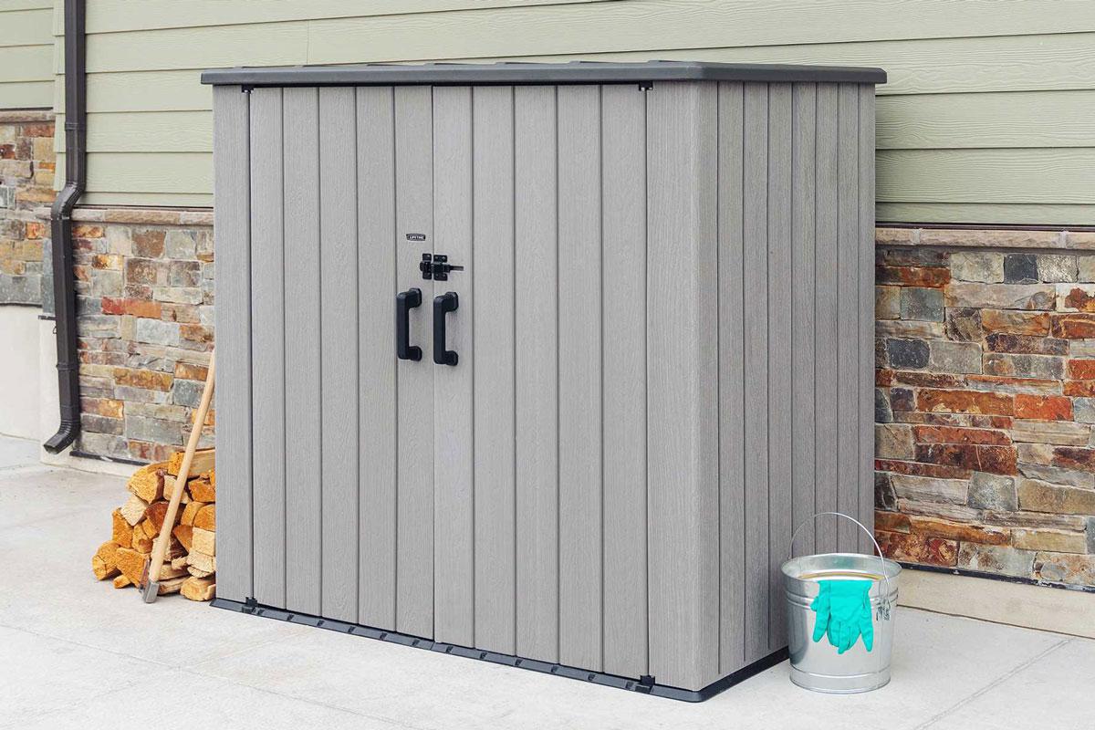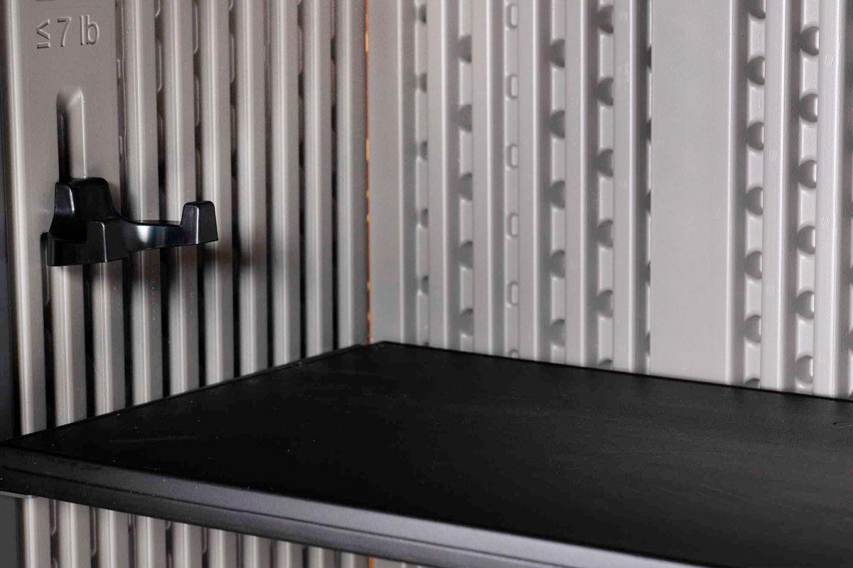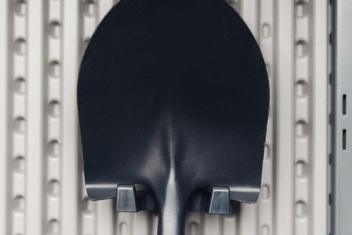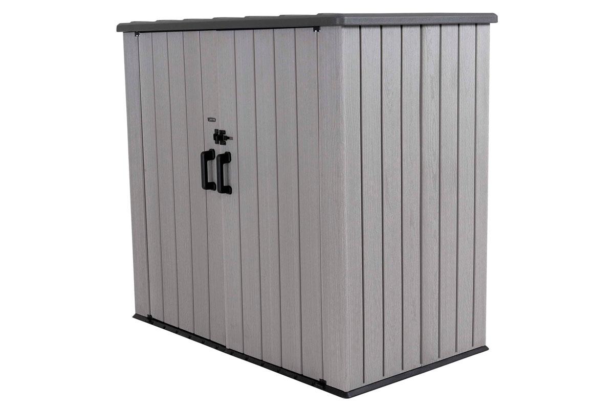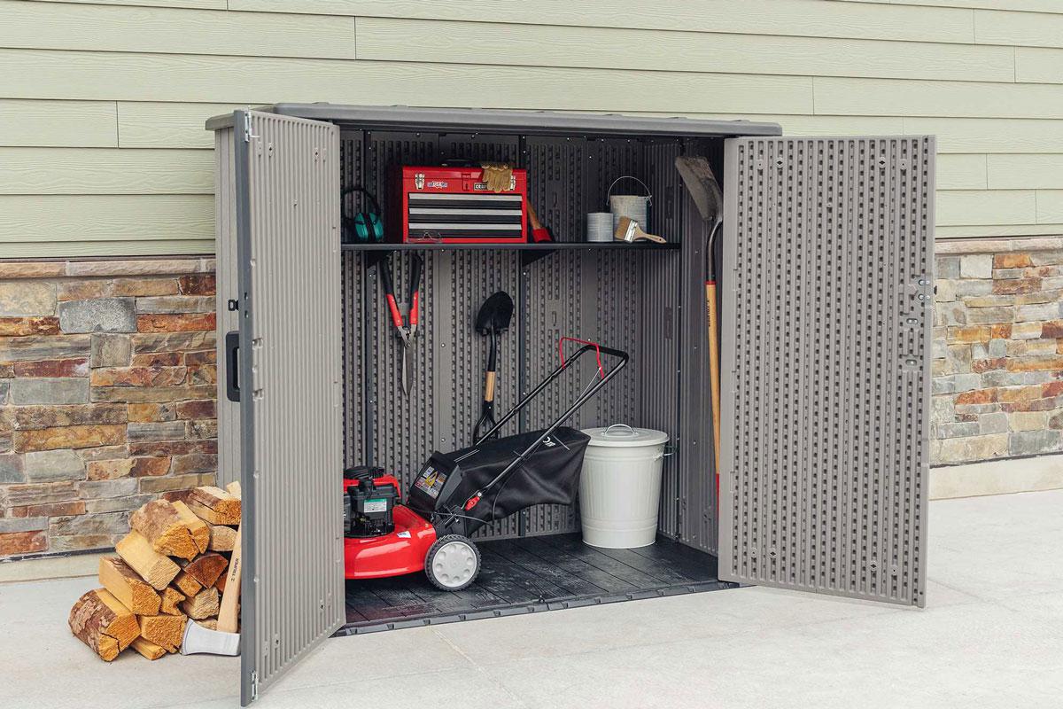 Хозяйственный ящик вместит в себя бытовые мусорные контейнеры, газонокосилки (шириной до 60см) и велосипеды, он также укомплектован стеллажами и съемными настенными крючками для небольших предметов, таких как ручной инструмент, шнуры питания, лопаты, грабли.