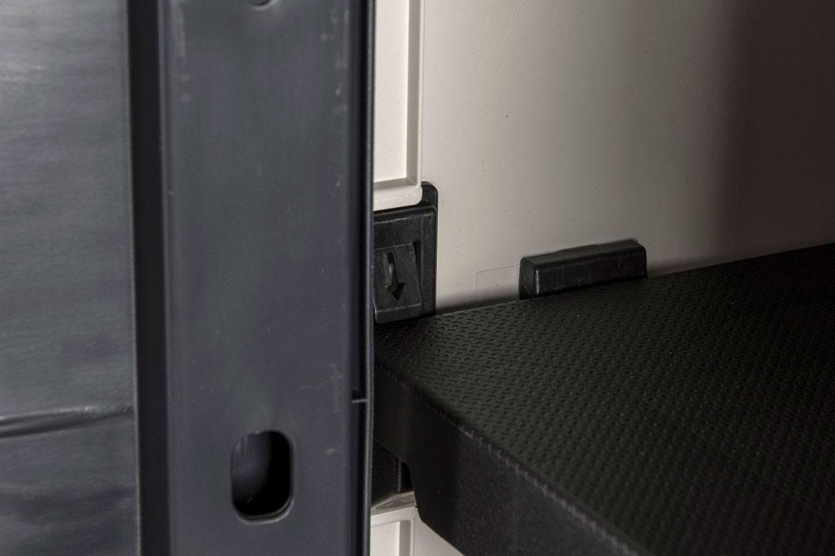 В комплекте 3 внутренние пластиковые полки, которые можно отрегулировать по высоте, усиленные петли, гнездо для замка (не входит в комплект) и монтажные отверстия в задней стенке, которые позволяют привинтить шкаф к стене для большей безопасности в случае сильного ветра.