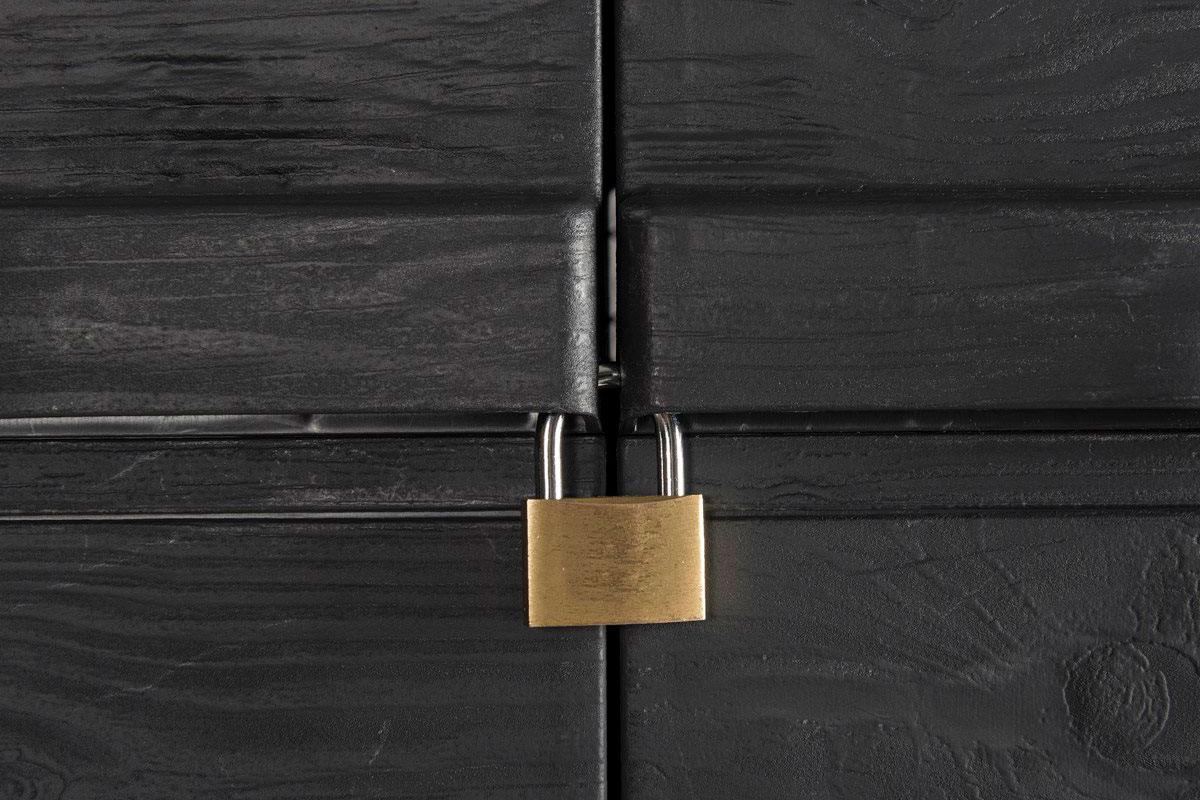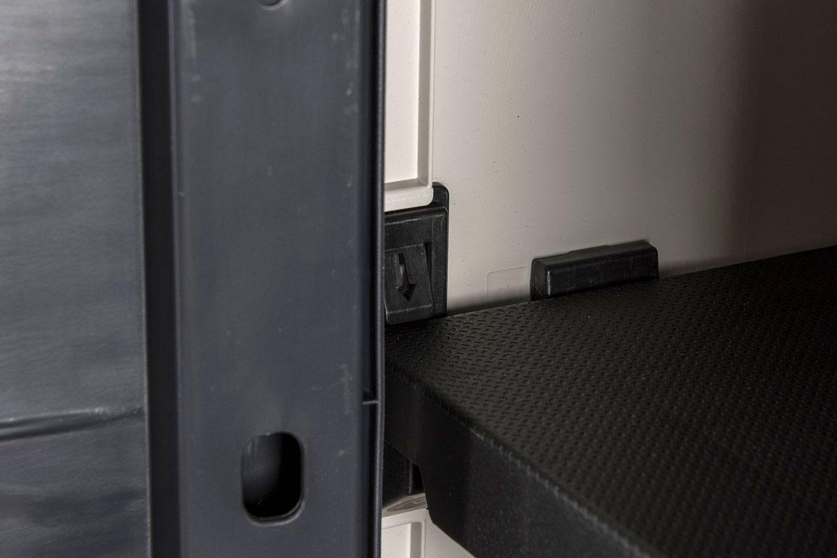 В комплекте 4 внутренние пластиковые полки, которые можно отрегулировать по высоте, усиленные петли, гнездо для замка (не входит в комплект) и монтажные отверстия в задней стенке, которые позволяют привинтить шкаф к стене для большей безопасности в случае сильного ветра.