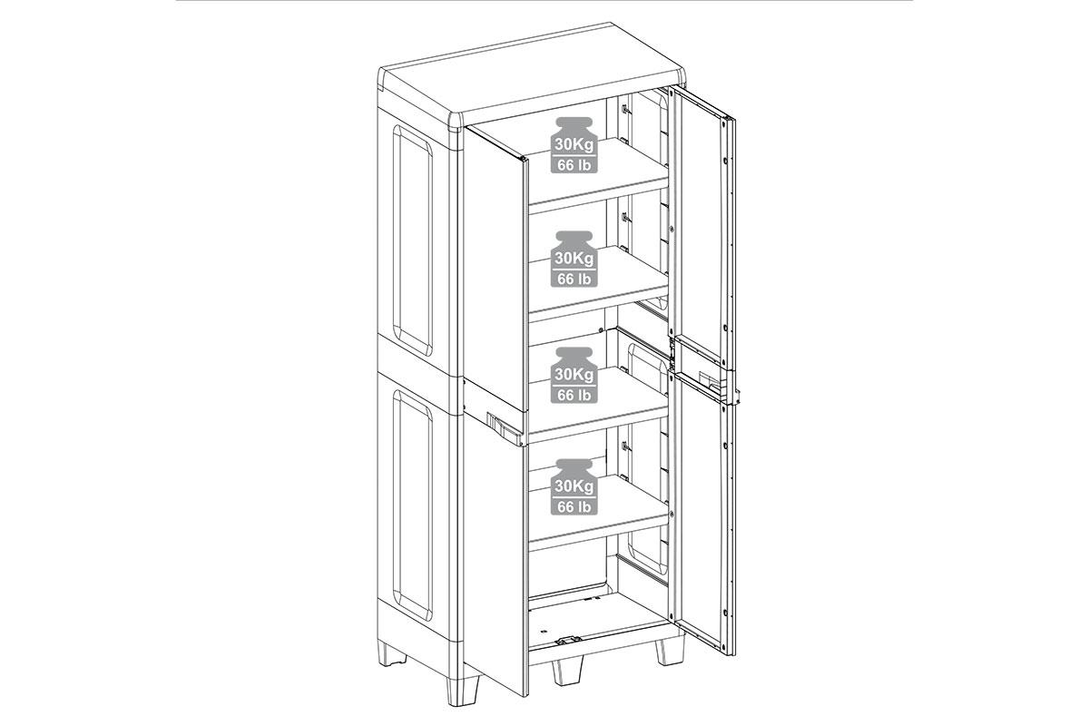 Большим преимуществом шкафа TOOMAX по сравнению с остальными шкафами являются большие размеры и ЭКСТРА-ПРОЧНЫЕ полки , каждая из которых выдерживает до 30 кг. Нет выступающих ручек (безопасно для детей). Оформление в деревянном стиле. Устойчивость к низким температурам. Применение внутри помещения и на улице. Регулируемая высота ножек. Быстрая сборка - 15 мин и легкий вес – 21,5кг.