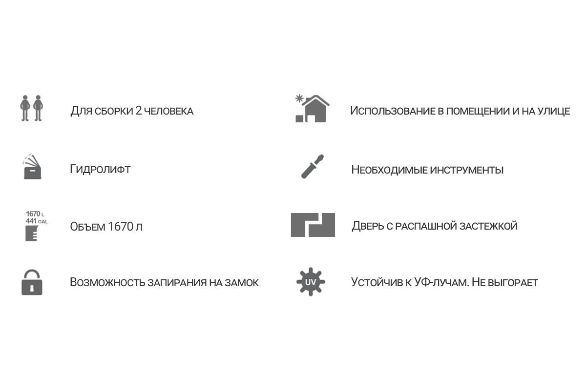 Для уличного хранения хозинвентаря, садового инвентаря, подушек уличной мебели, химии для бассейнов, детских игрушек, строительных материалов.