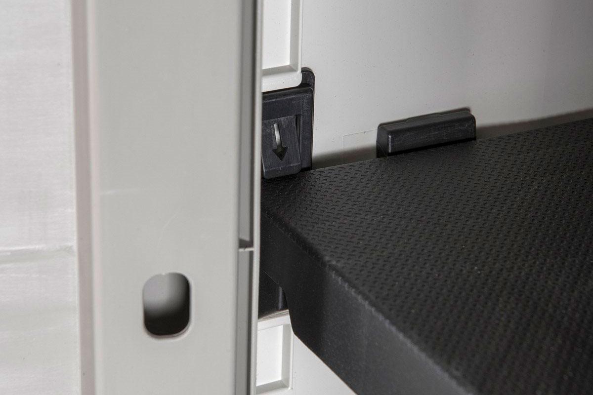 В комплекте 3 внутренние пластиковые полки, которые можно отрегулировать по высоте, усиленные петли, гнездо для замка (не входит в комплект) и монтажные отверстия в задней стенке, которые позволяют привинтить шкаф к стене для большей безопасности в случае сильного ветра.
