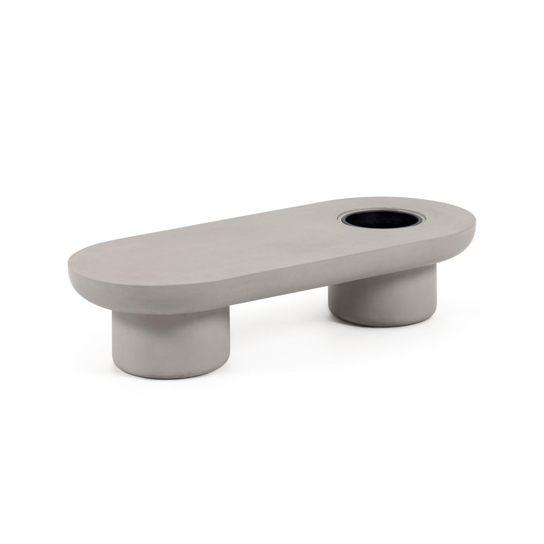 Журнальный столик Taimi от фабрики La Forma (ex Julia Grup) – пусть ваша уличная обстановка станет оригинальной. Журнальный столик Taimi – уникальная дизайнерская вещь для вашего сада или террасы. Здесь столешница объединена с горшком для цветка. Заняв его любимым растением, вы обеспечите себе уже совершенно иную атмосферу – это красота природы, до которой будет так легко коснуться. Сколько прослужит этот стол? А сколько живет камень? Эта вещь поселится у вас навсегда. Журнальный столик полностью сделан из бетона в натуральной отделке серого цвета. Бетон – натуральный материал, который не портится от влаги, солнца. Он долговечный и прочный. Справа в столешнице находится горшок для цветка, в который можно посадить цветы или небольшое дерево. Его диаметр – 28,5 см. Снизу предусмотрен клапан для водоотвода. Толщина столешницы составляет 10 см. Ее боковая грань закруглена, благодаря чему риск поцарапаться о кромку минимален. Ножки в диаметре 35 см обеспечивают хорошую устойчивость, даже на неровной поверхности. Размеры: ширина – 140 см, высота – 30 см, глубина – 60 см. Сборка не требуется. В коллекции Taimi также представлены круглые столики в двух размерах и цветах и табурет. Просим вас обратить внимание на следующий важный момент: если вы планируете хранить уличную мебель на открытом воздухе, пожалуйста, защитите ее водонепроницаемым чехлом в осенний, зимний периоды и во время сезона дождей. Это поможет сохранить мебель в отличном состоянии и продлить ее срок службы.