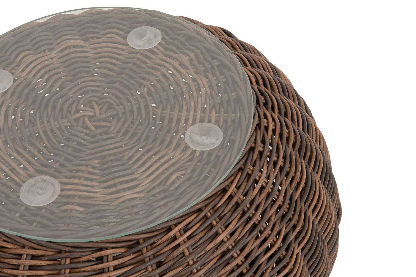 Круглый кофейный столик «Барселона» для создания небольшой зоны отдыха в саду или на открытом балконе. Каркас изготовлен из легкого алюминия и оплетен искусственным ротангом натурального коричневого оттенка. Поверхность столика дополнена стеклянной столешницей из закаленного стекла, толщиной 5 мм. Габариты изделия: диаметр столешницы – 600 мм, высота столика - 390 мм.