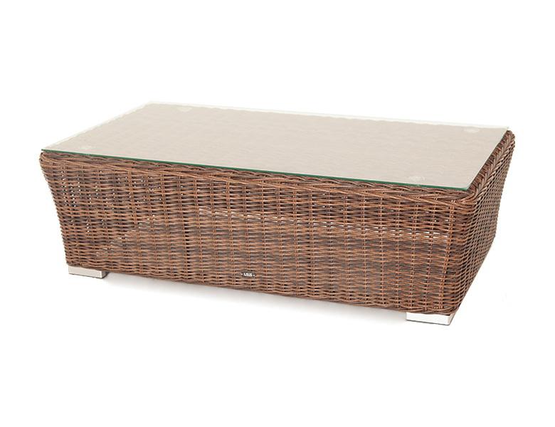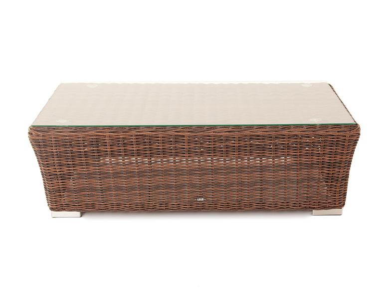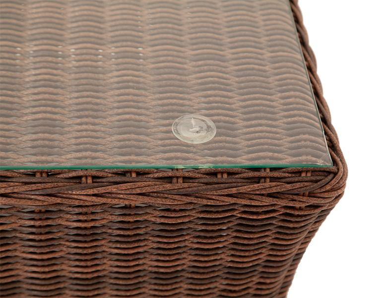 Журнальный столик «Капучино» гармонично дополняет любую плетеную мебель и может использоваться вместе с креслами, диванами или шезлонгами. Размер модели – 1100×660×340 мм. Алюминиевый каркас принимает на себя основную нагрузку и отвечает за надежную фиксацию всей конструкции. Искусственным ротангом полностью оплетен каркас, включая верхнюю поверхность столика. Ротанг имеет круглое плетение коричневого цвета. Столешница журнального столика выполнена из закаленного прочного стекла толщиной