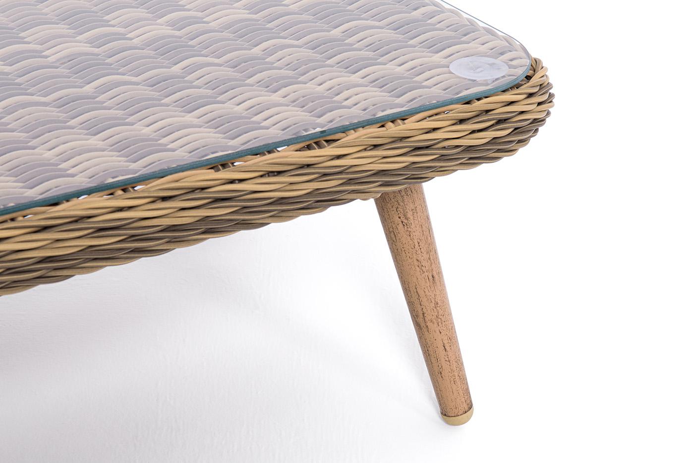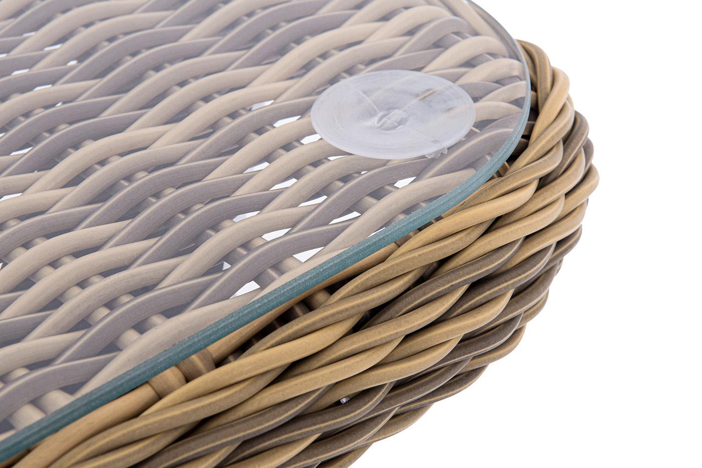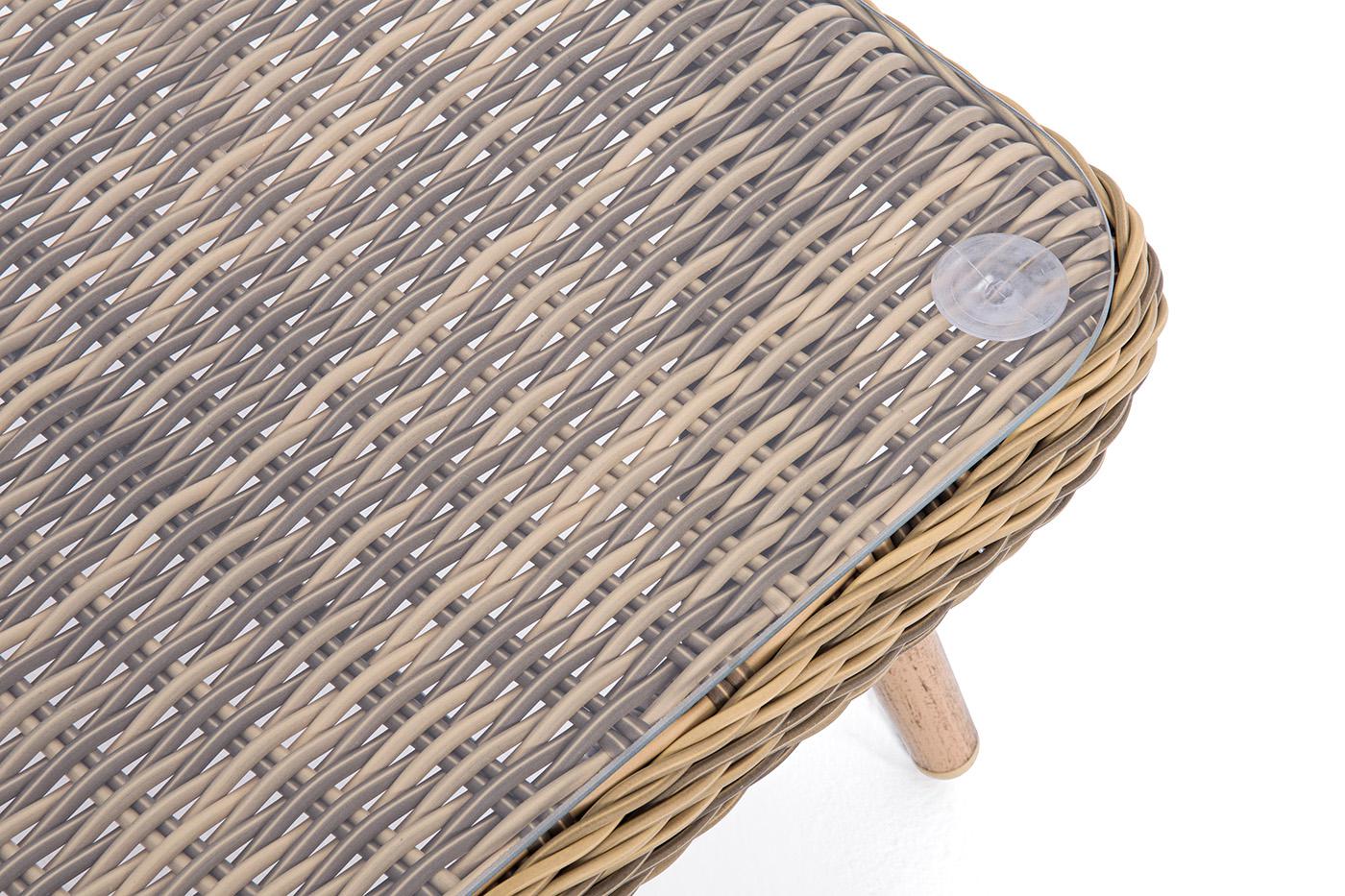 Журнальный столик «Прованс» является удачным дополнением для кресел и диванов из той же линейки мебели. Размер модели – 1200×580×330 мм. Алюминиевый каркас имеет цвет натурального дерева. Столик дополняет декоративная оплетка, при изготовлении которой используется круглый искусственный ротанг. Она представлена в соломенном цвете. Столешницу из ротангового плетения дополняет прочное стекло, используемое для изготовления мебели. Стекло крепится с помощью держателей на силиконовых присосках и т