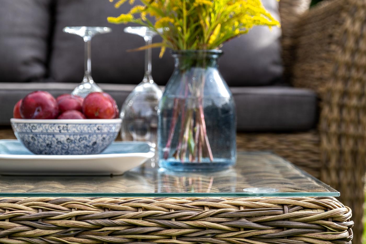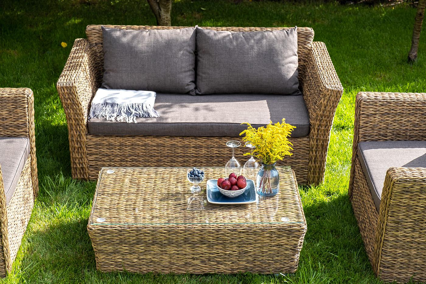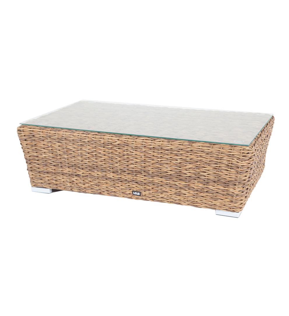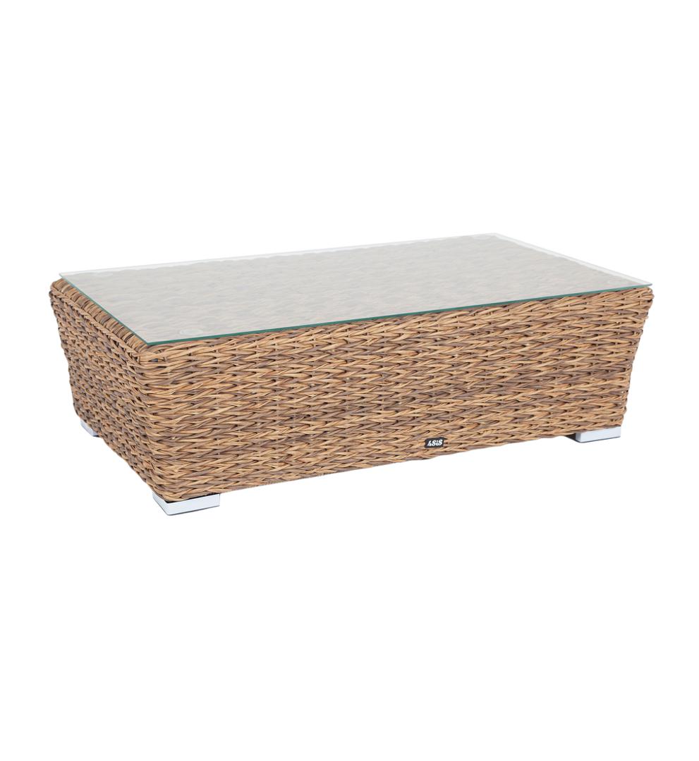 Журнальный столик «Капучино» является хорошей парой к трехместному дивану, который представлен в этой мебельной коллекции. Размер модели – 1100×660×340 мм. Устойчивость и прочность ей придает каркас, выполненный из высококачественного алюминия. Каркас оплетен вручную с помощью искусственного ротанга вида "гиацинт". Мебель выполнена в соломенном цвете. На поверхности столика прочно закреплена столешница из прозрачного стекла, что позволяет транспортировать мебель в собранном виде. Столик
